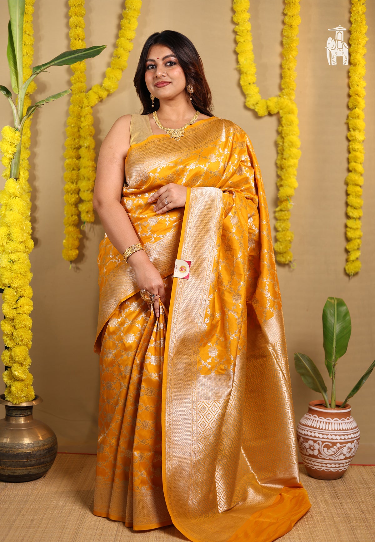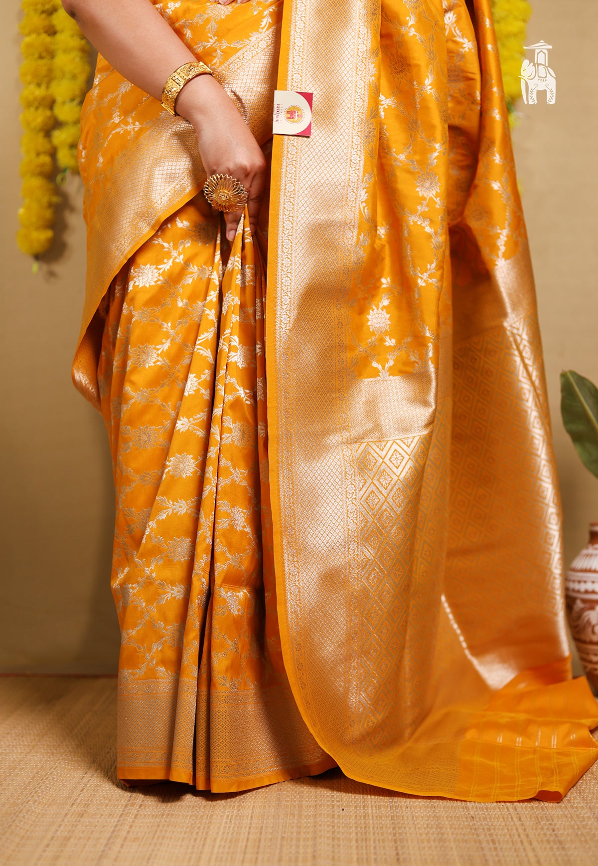 Our elegant Marigold Orange Mashru Katan Banarasi Saree is genuinely crafted for celebrations & your special functions.