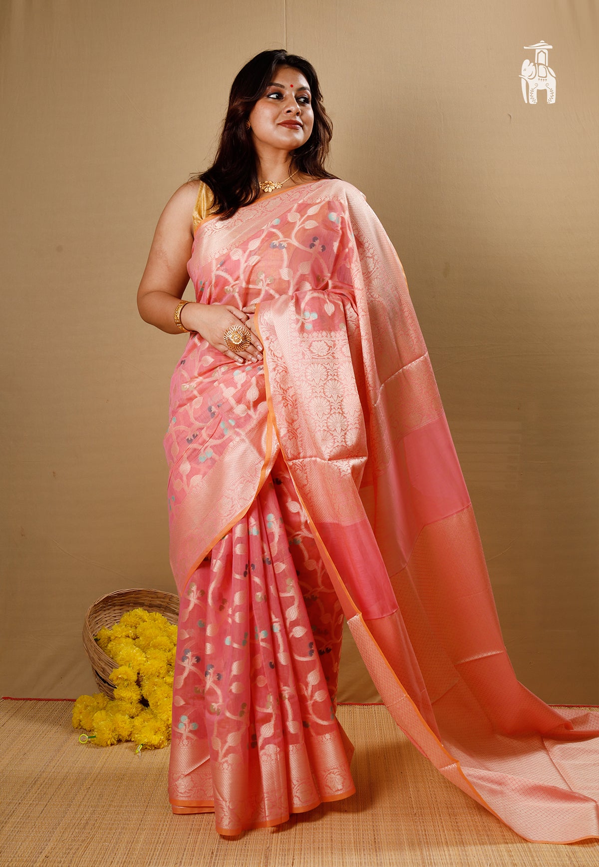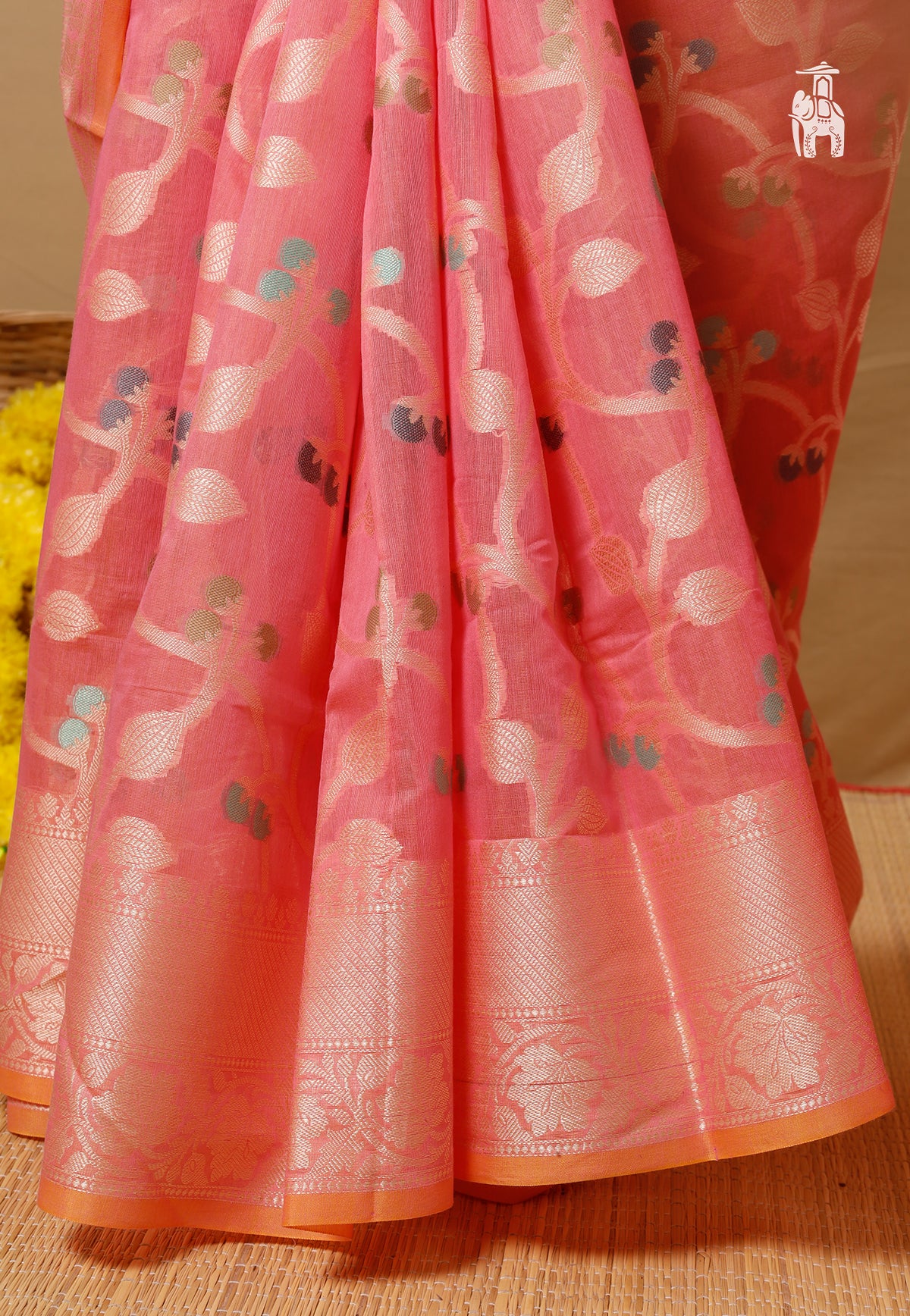 Drape yourself in the soft glow of this Pink Chanderi Silk Saree, featuring intricate floral motifs and a gorgeous border.