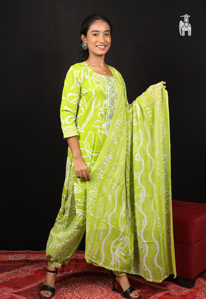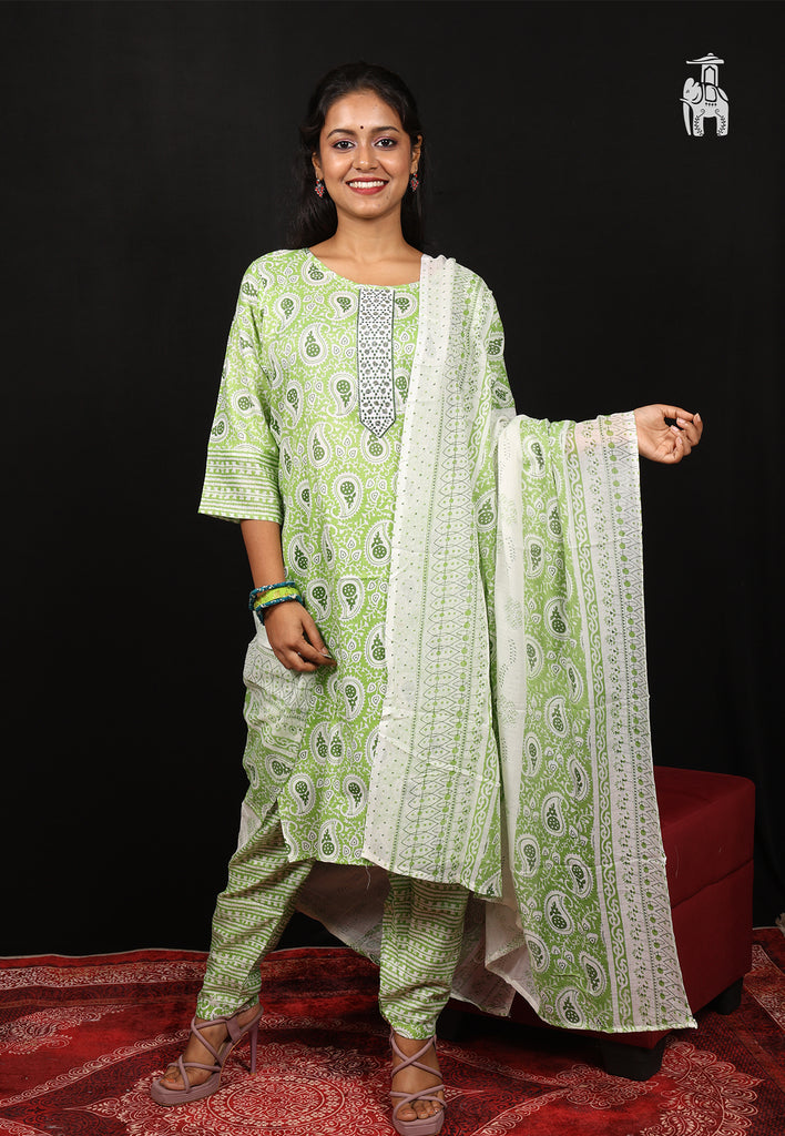 Looking for a comfortable Suit to wear at home or the office? Grab this Green Printed Suit Set with traditional blockprints, on its round neckline Kurta, that comes with a pant & a flowy, easy-to-carry dupatta as well. Get this 3-piece Suit set at just ₹1450 only.