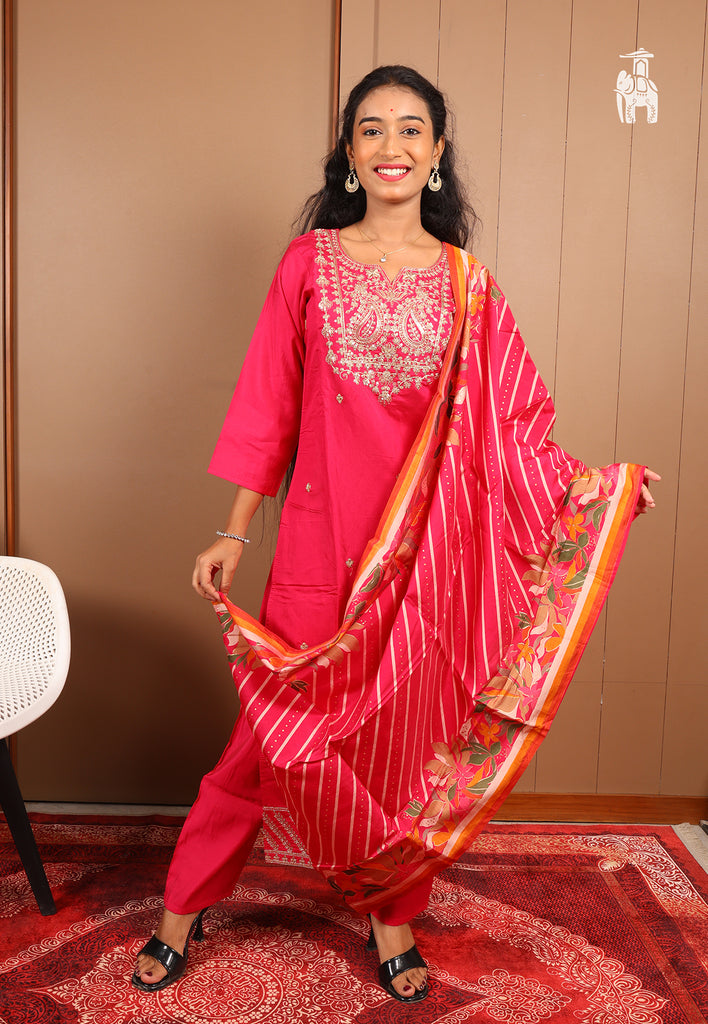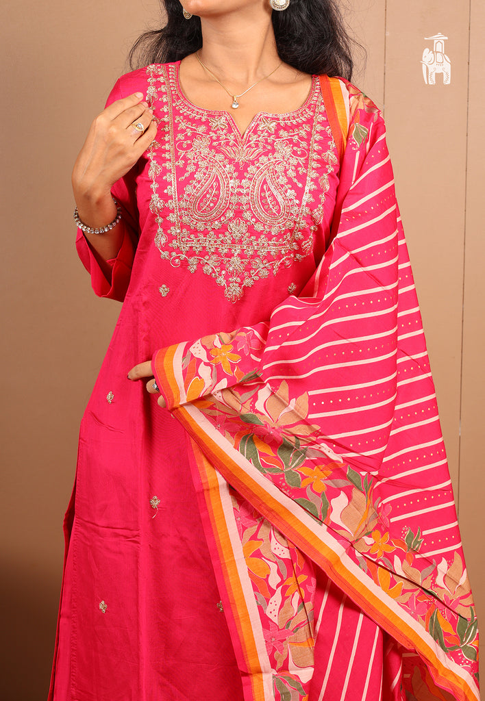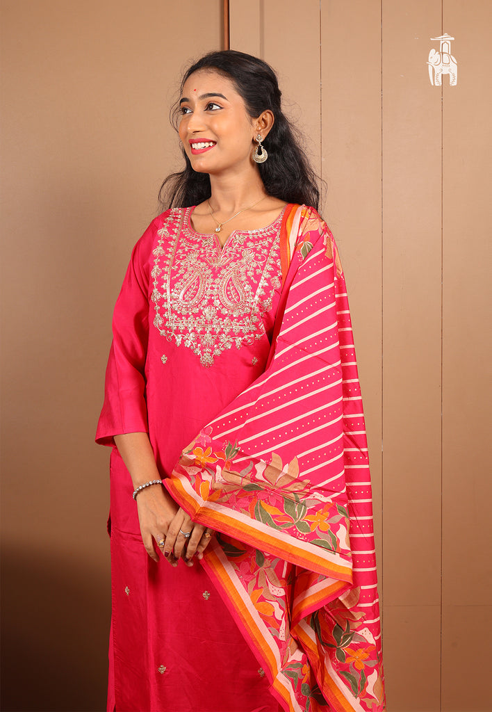 Brighten your festive glow with this beautiful Bright Pink Suit Set with the finest designs in its neck area.