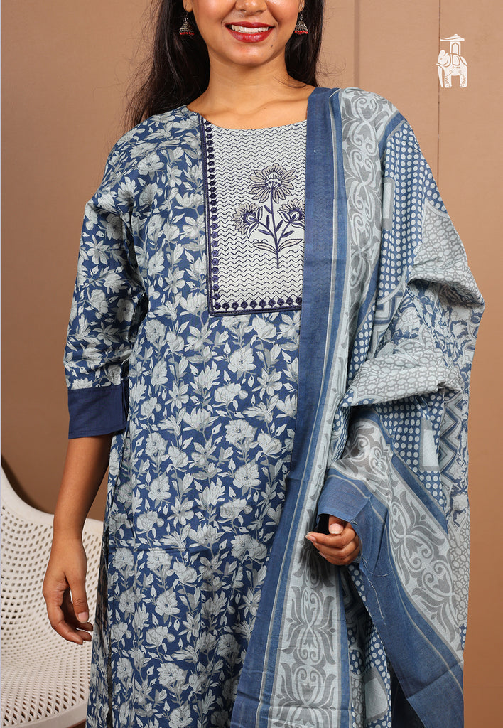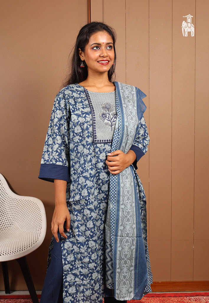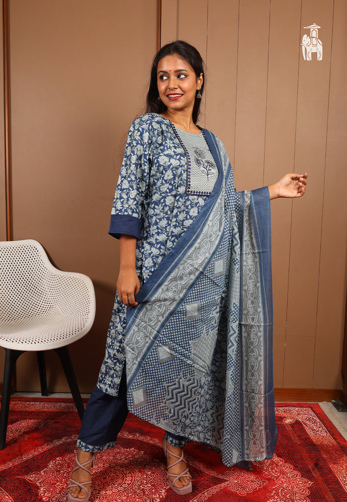 This Suit set offers a floral printed Kurta, with a round neckline & three-quarter sleeves, giving you a classy look.