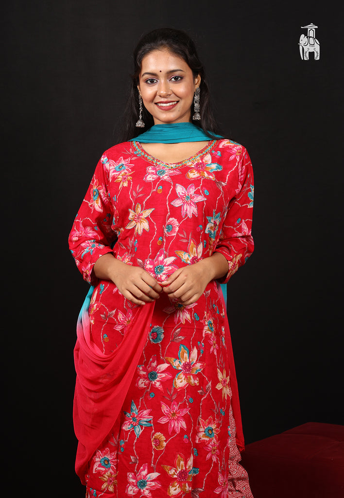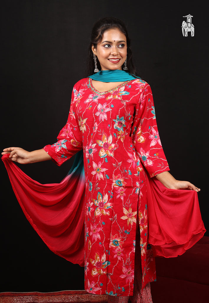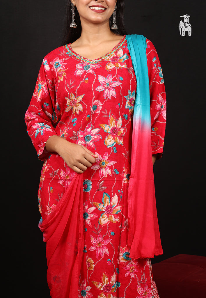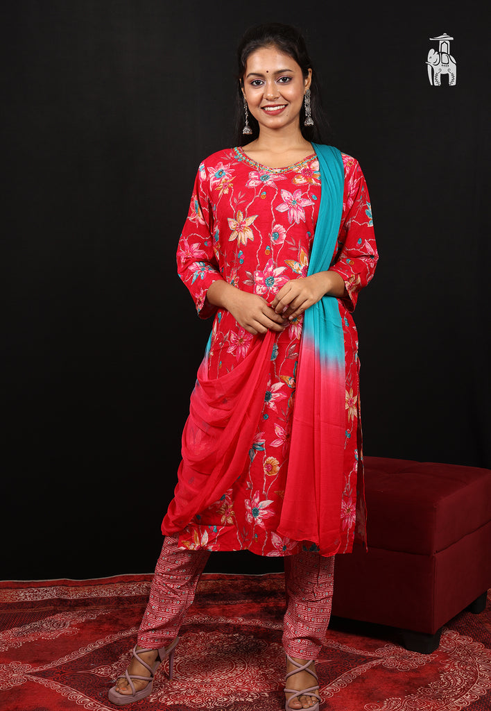 Get this Red Suit Set, in beautiful floral prints, with a dual-colored dupatta & lovely pants.