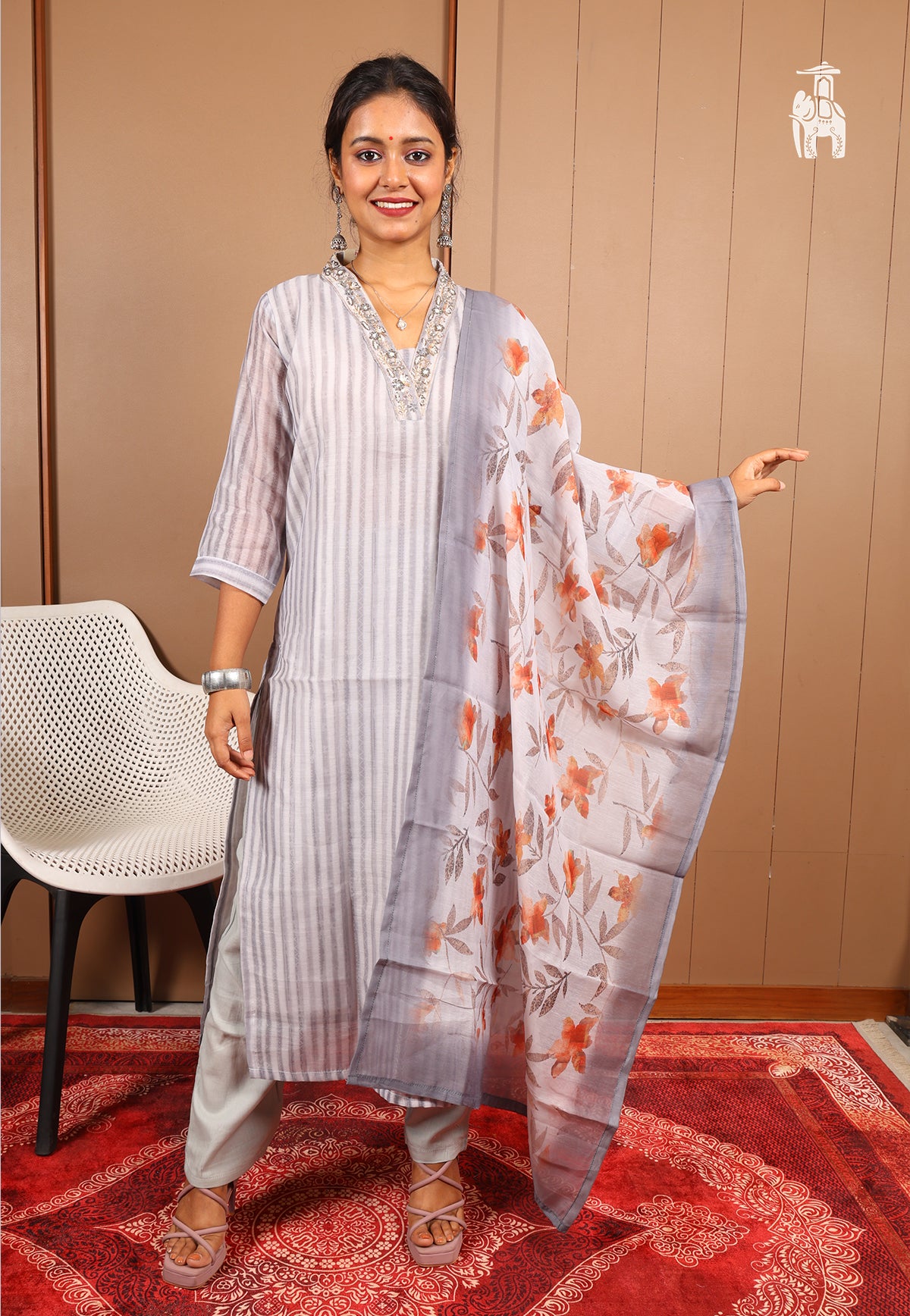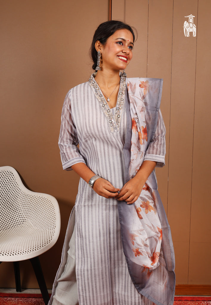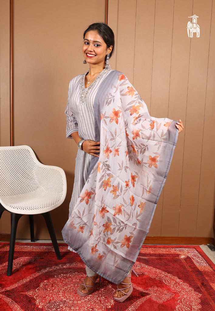Get this fancy Grey Suit Set exclusively from Legacy of Bhojraj. This suit brings you a combination of Suit, bottomwear & floral printed dupatta.