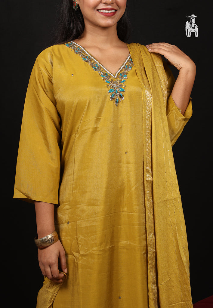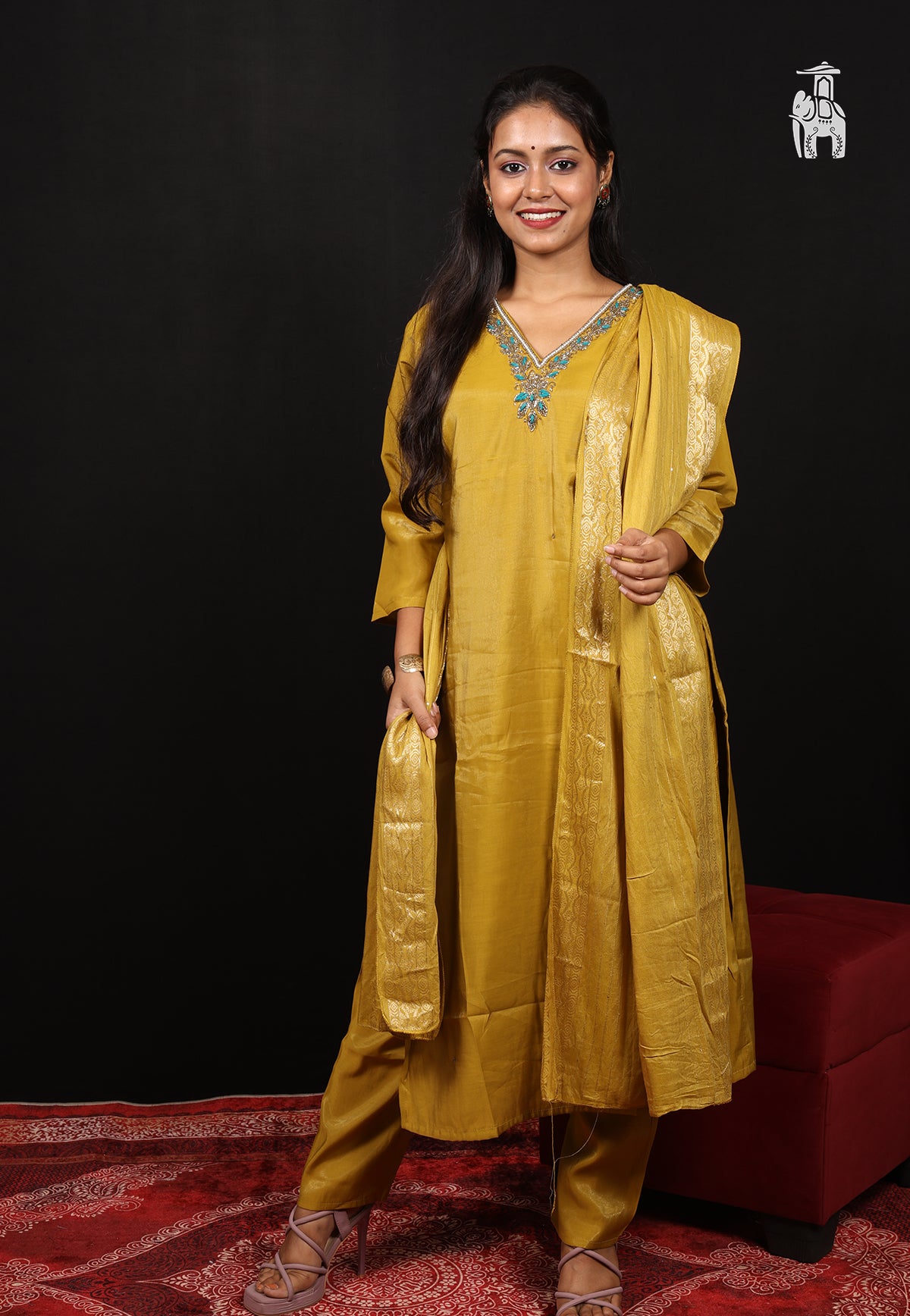 Get dressed for your Diwali party look, in this lustrous Lemon Yellow Suit Set, that comes with a straight fit Kurta, pants & a dupatta.