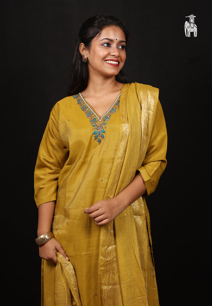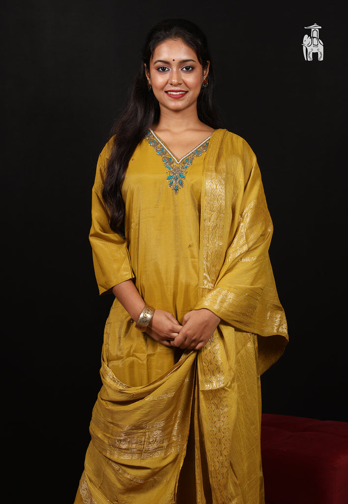 Kurta comes with stunning Floral printed V-neckline, simple pants, and a lustrous dupatta, in a Golden Yellow shade.