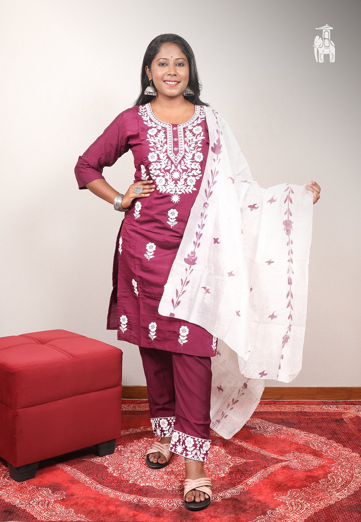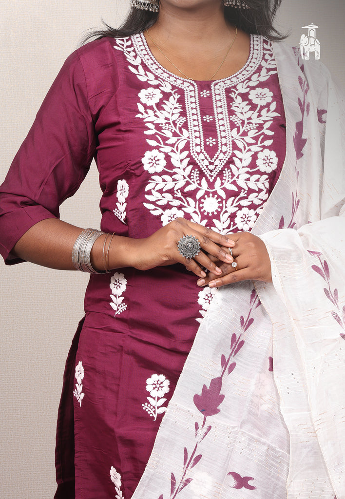 Kurta offers intricate embroidery detailings, with a subtle toned White dupatta, to go with the vibe of your Suit Set.