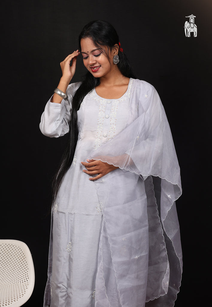 This Suit features all over embroidery work, on soft Mauve straight fit Kurta, that comes with it’s finest pants & a dupatta.