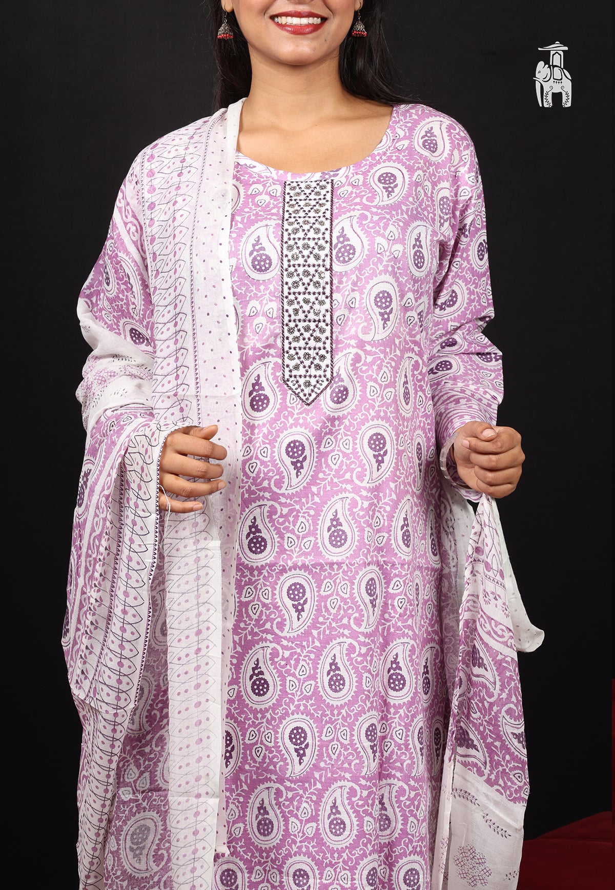 It’s 3-piece suit set that comes with a straight fit, long kurta, fitting trousers & a dupatta to complete your look for the day.