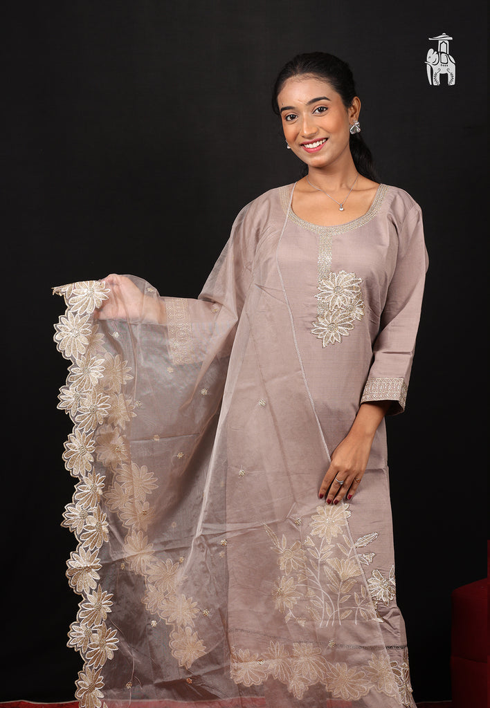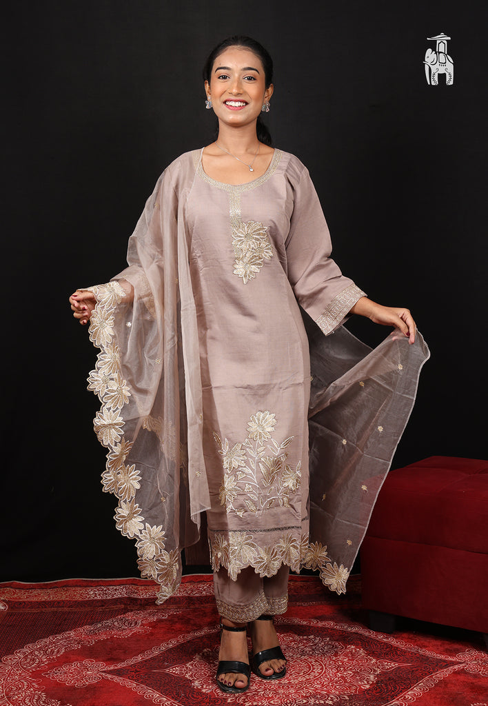 This 3-piece suit set brings you a stylish Mauve straight fit kurta, with an floral embroiderd designs, & lace borders. You get a matching trousers & a transparent dupatta as well.