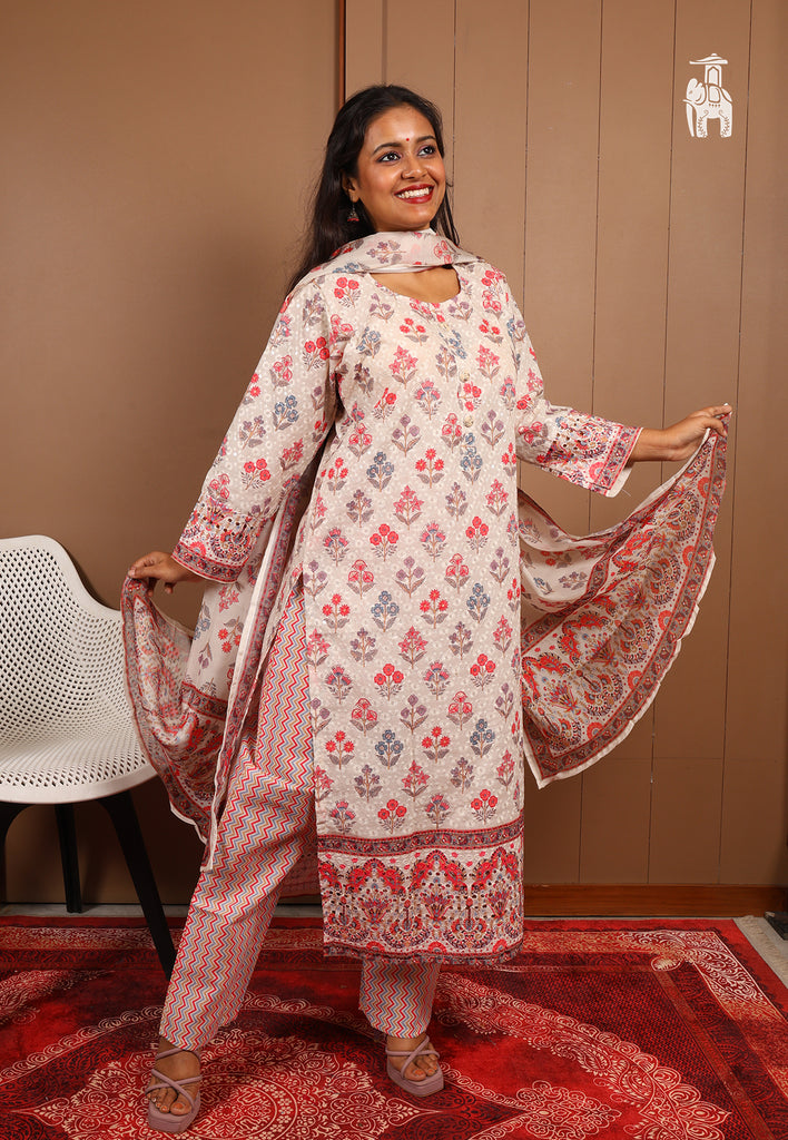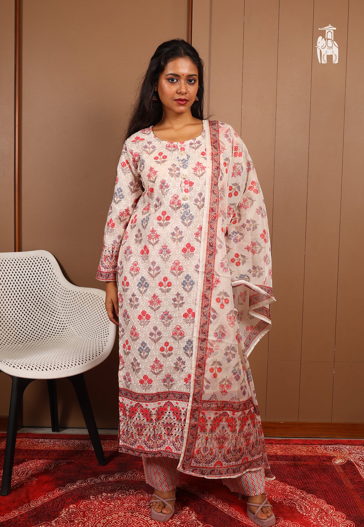 Suit set features a combination of a floral printed Kurta, cozy pant & a dupatta with matching designs.