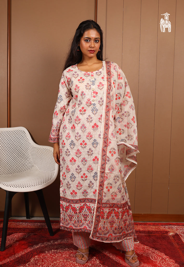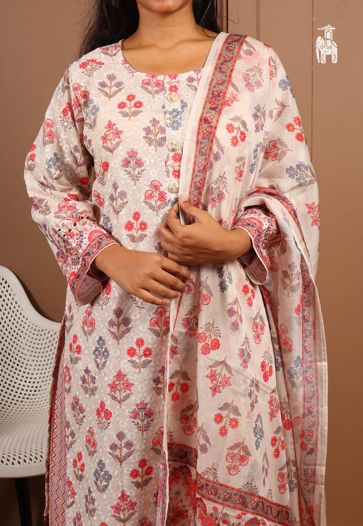 Get dressed in festive elegance, wearing this Floral printed Off White Suit set exclusively from Legacy of Bhojraj.