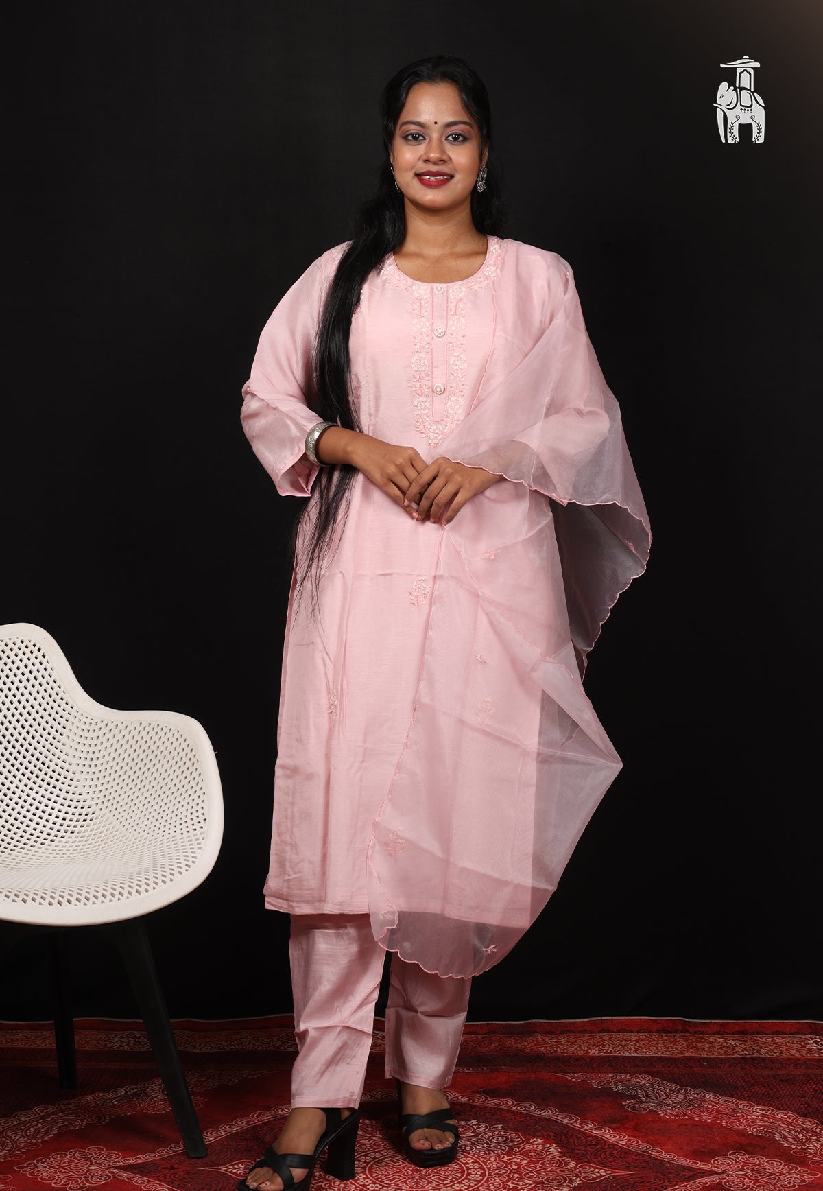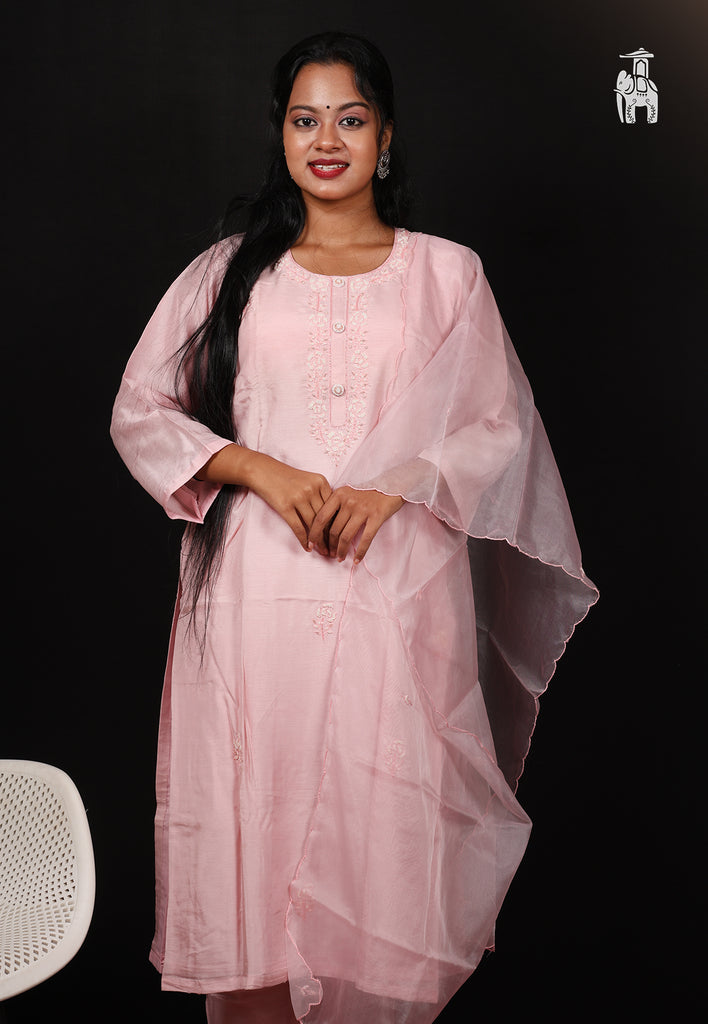 Got invited for a religious function? Pick this Pink Suit Set in mild shade of Pink, that comes with a comfortable set of kurta, pant & a dupatta.