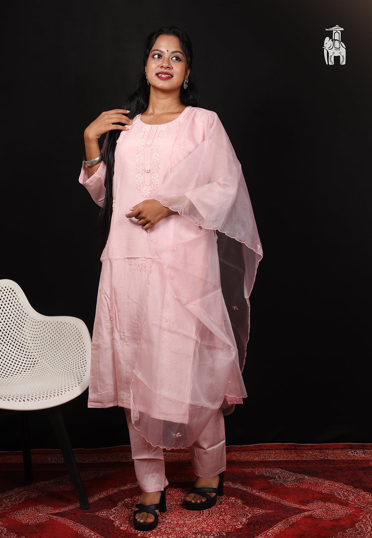 On the Kurta, you get finest details of embroidery, with plain pants in the matching shade. A transparent, net dupatta adds the charm to your overall ethnic appearence.