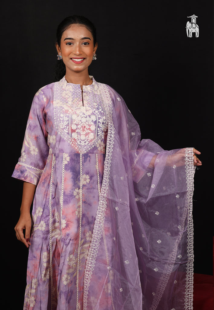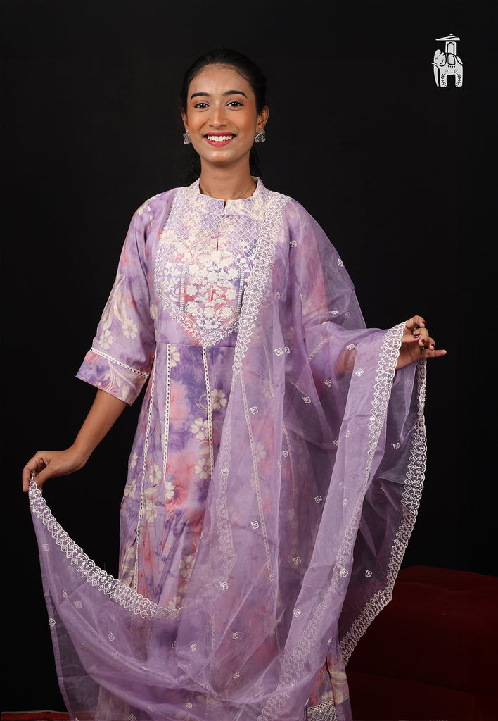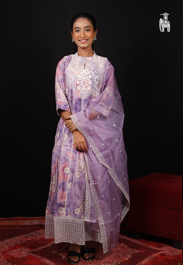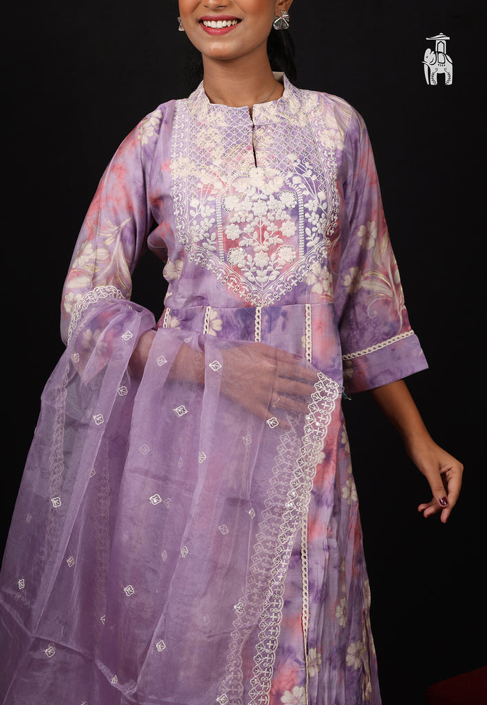 Check out this special party wear Purple Floral Suit set, in trendy embroidery designs & high neckline, designed just for your special occasions.