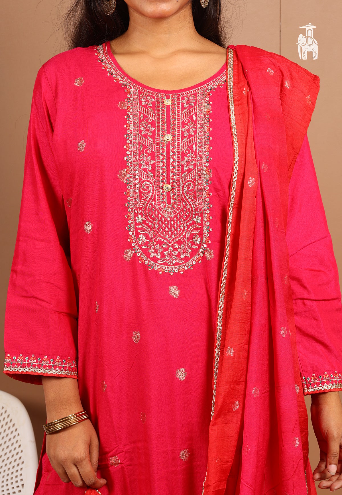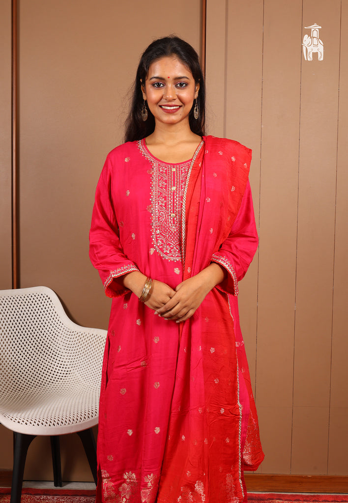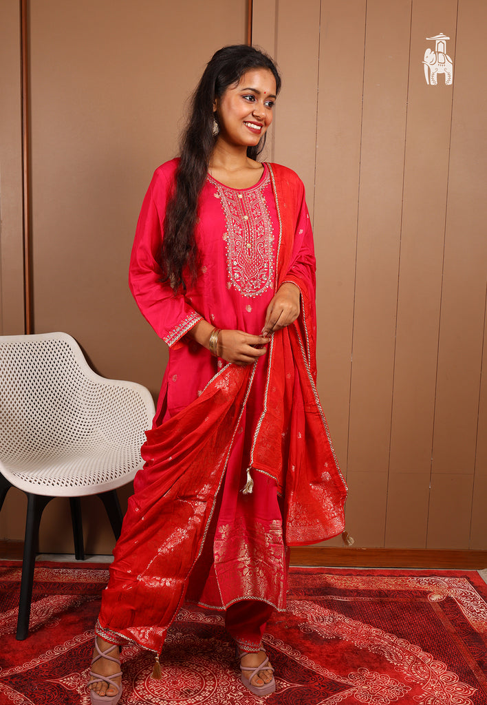 Whether it’s a wedding invitation or Diwali celebration, go for this Rose Red Suit Set, a stunning 3-piece set of Kurta, pant & dupatta.