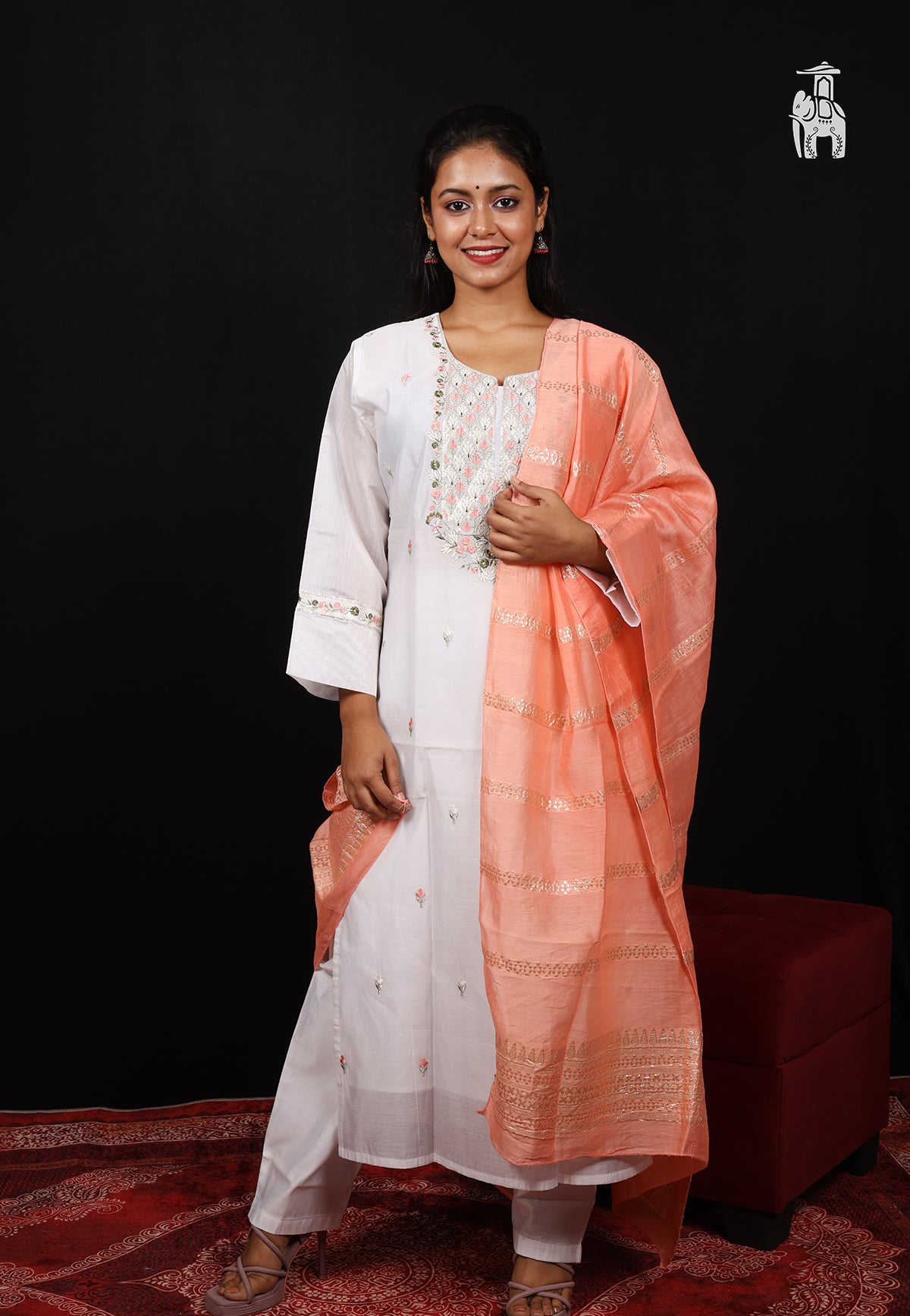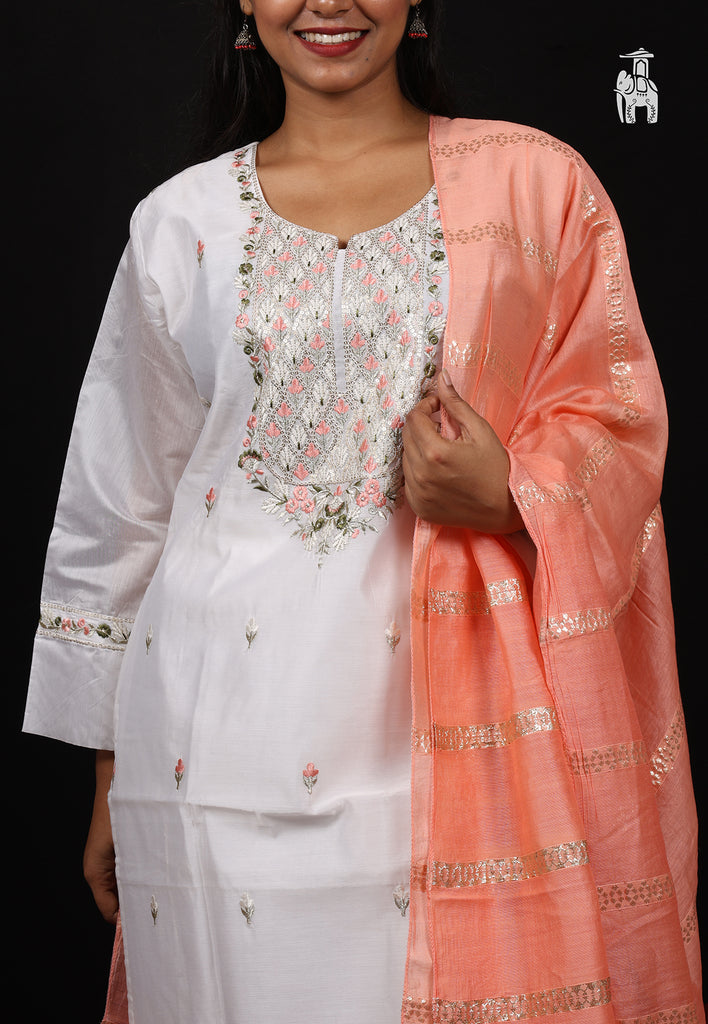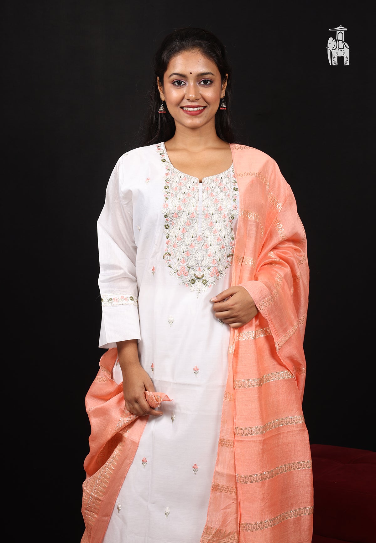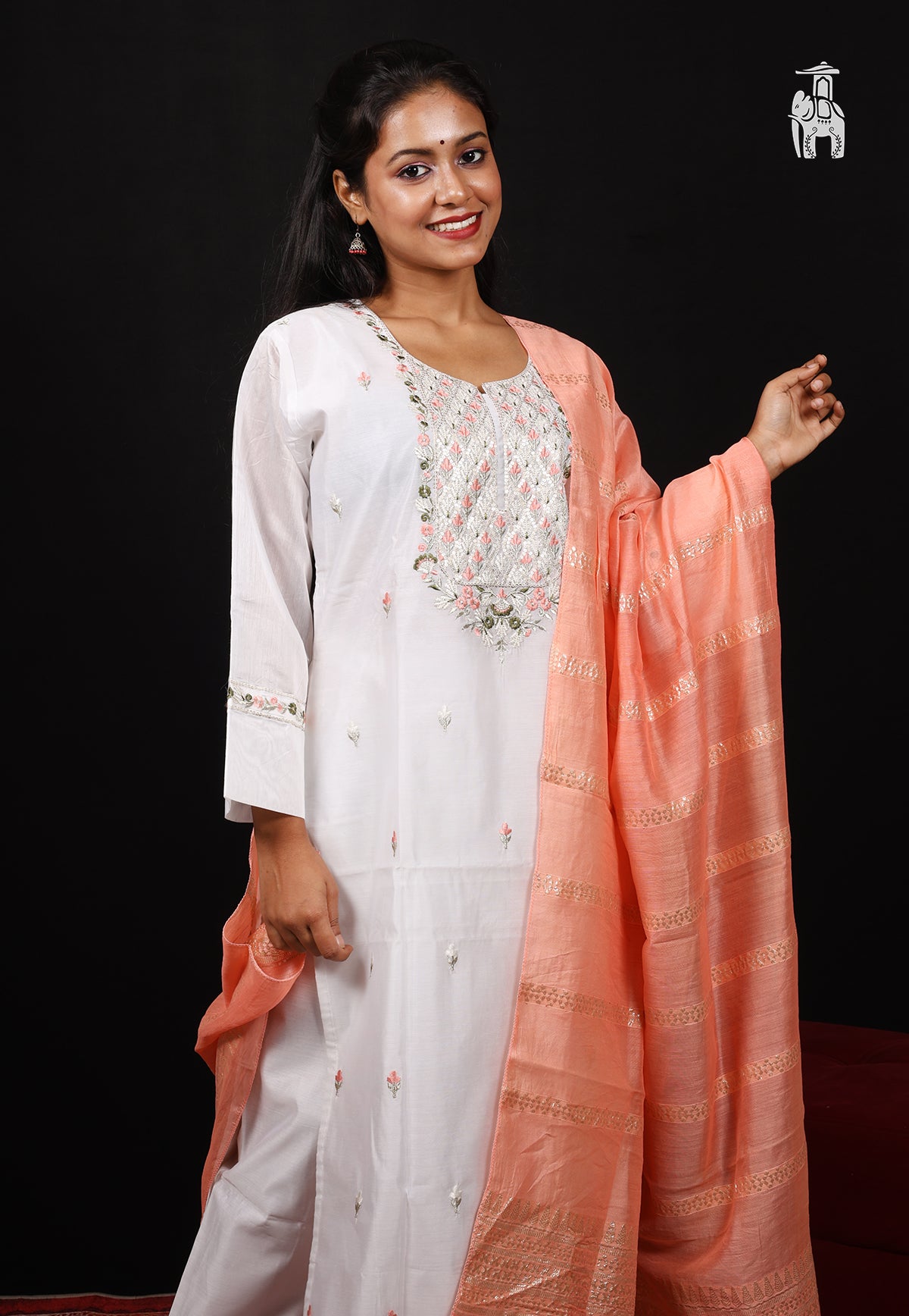 Stand out in your festive gatherings, wearing this brand new White Suit set, with a matching bottomwear & a dupatta.
