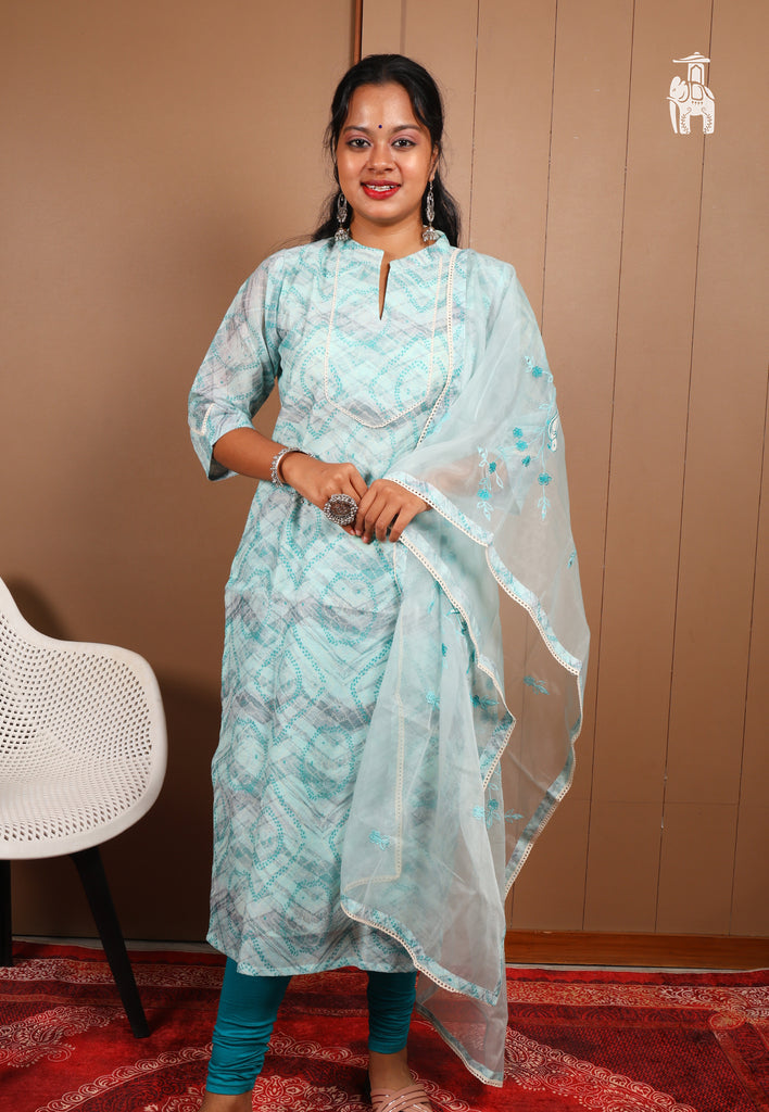 Planning for a new comfortable & festive suit? Get this special Powder Blue Suit Set with a high-neckline Kurta, featuring embroidered designs & three-quartered sleeves. Get it now at a prepaid payment of ₹1990.