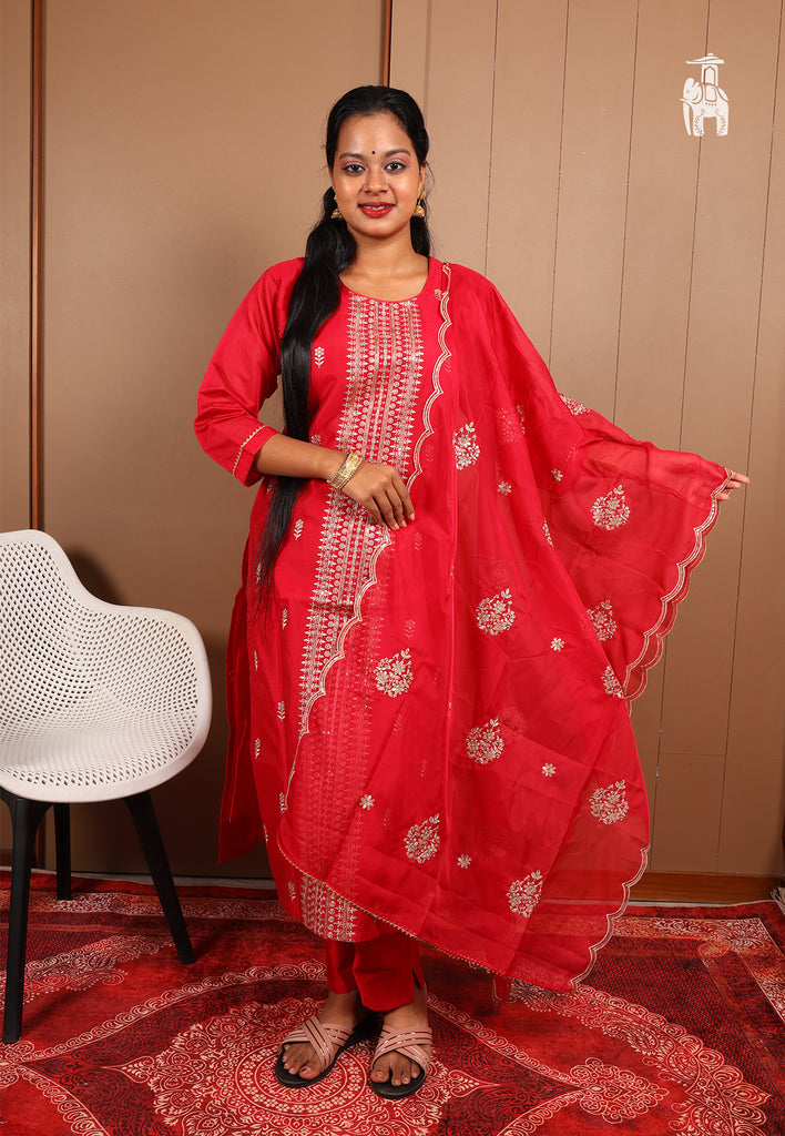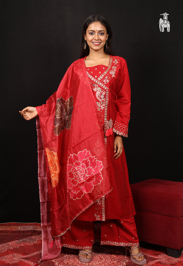 Get yourself a fashionable look in this Red Suit Set with embroidered round neckline & floral printed dupatta, priced at ₹2050. This Rayon woven Suit set offers you a stylish festive appearance for any occasion. Order now!