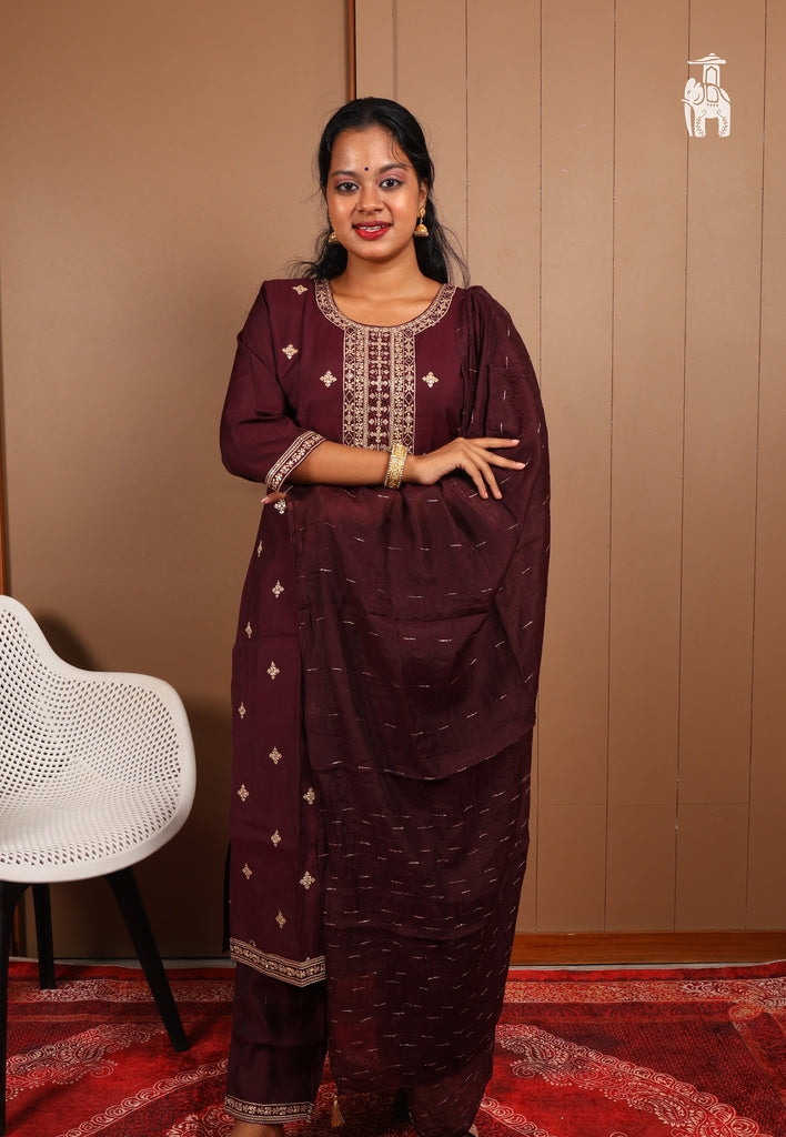 Embroidered suits are in trend these days. Check out this Maroon Suit Set with all-over floral embroidery details, comfortable pants & a matching dupatta, all at just ₹1850. Make it yours on prepaid payment to get FREE DELIVERY.