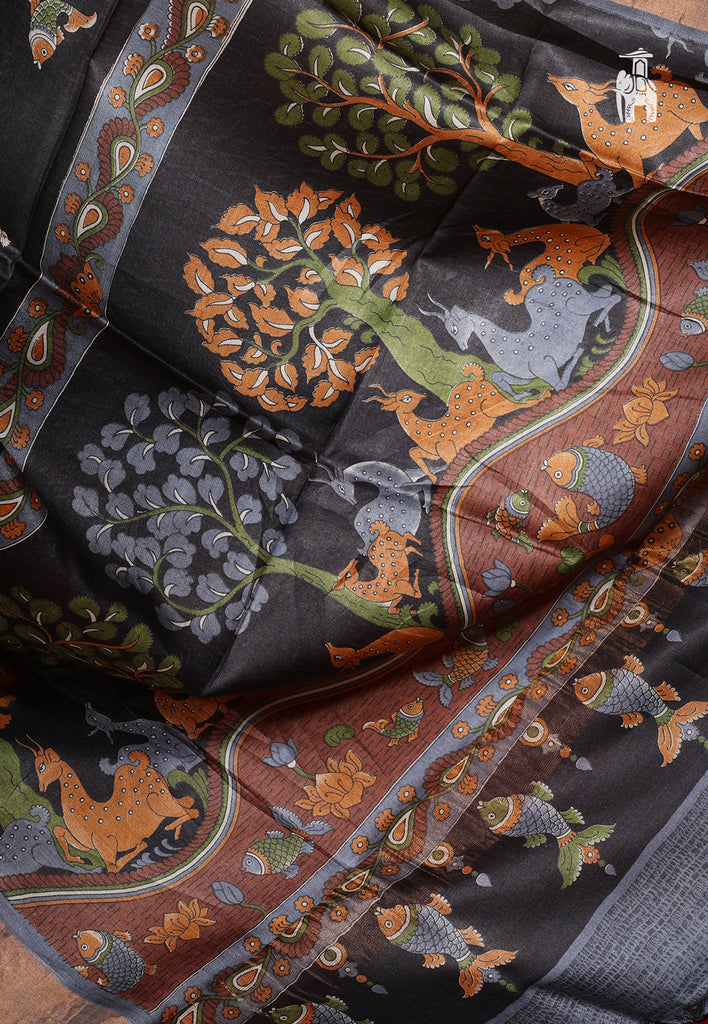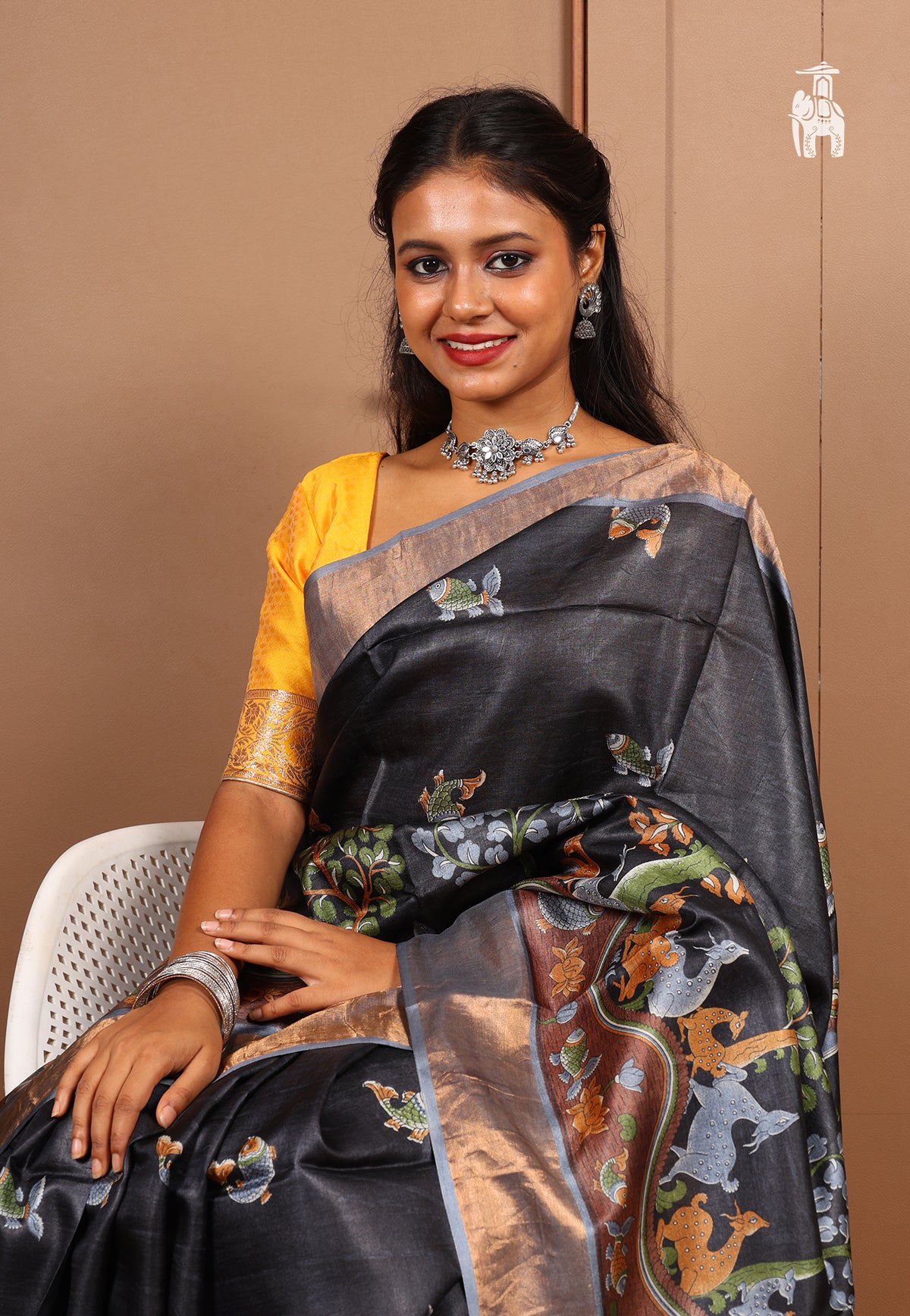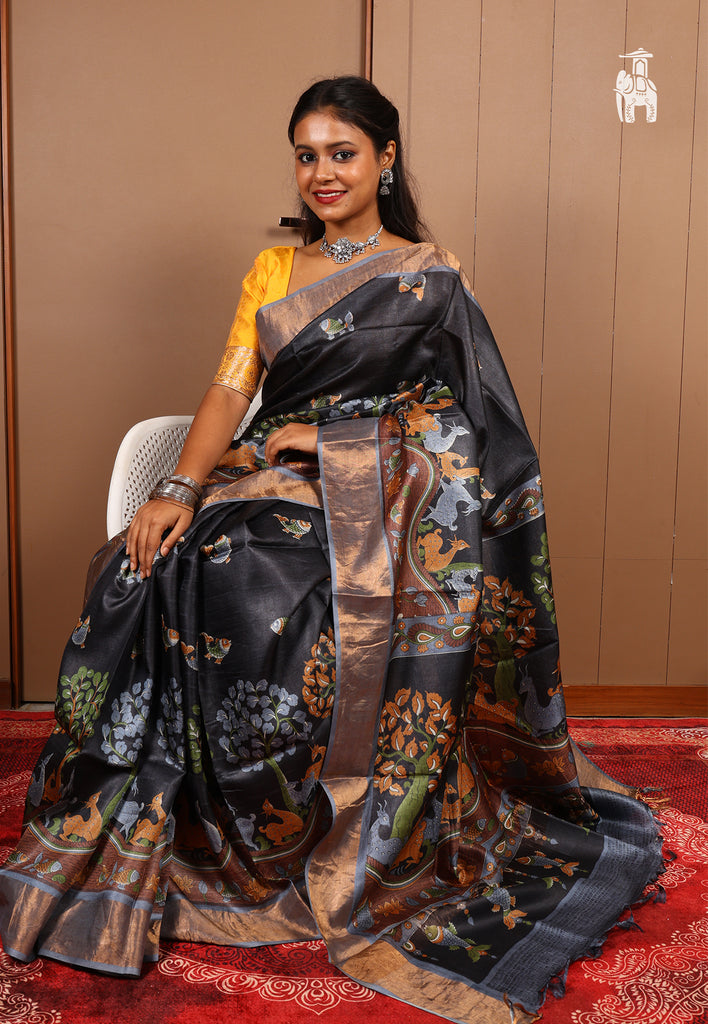 Feel special about your luxurious Pure collection, this Black Printed Pure Tussar Silk Saree with handblock prints of Pichoi artwork on Pure Silk fabric.