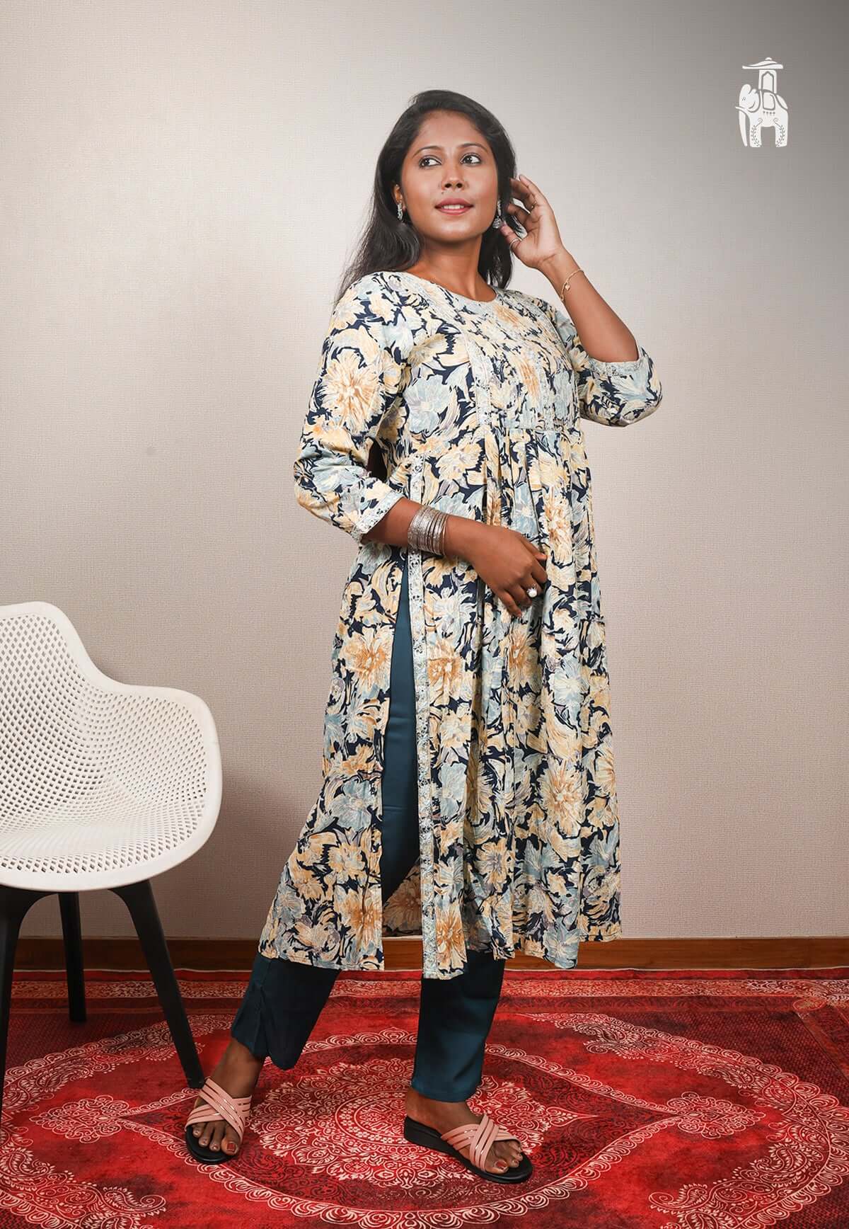Stand out in style, wearing this Blue Kurti pant set, with a stylish floral print, designed for casual hangouts or functions.