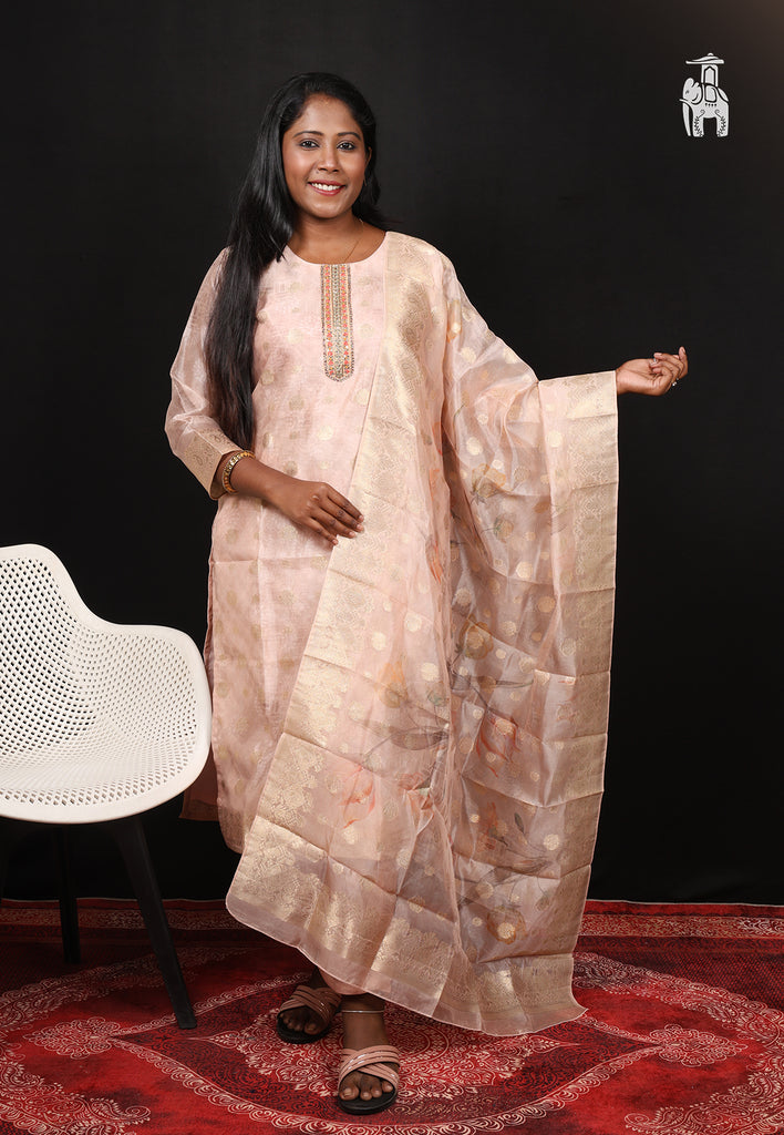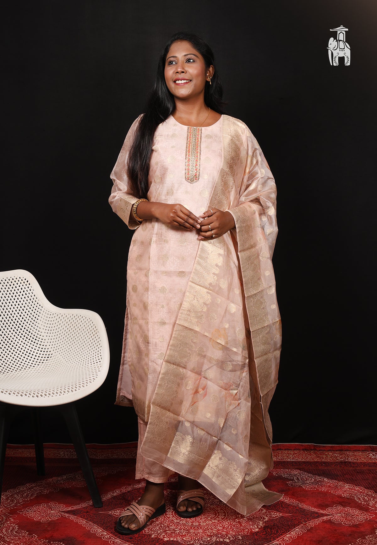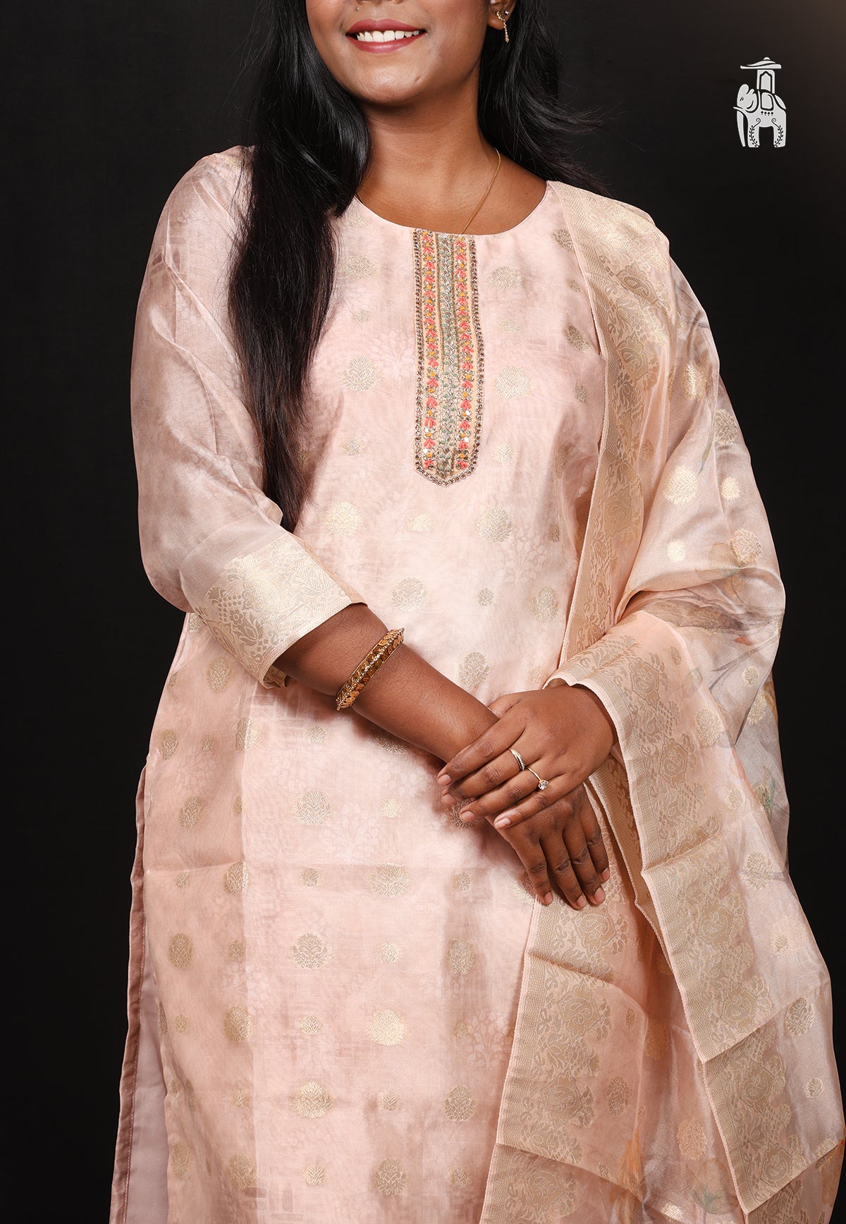 This Suit set is a 3-piece outfit, which comes with a straight fit Off White Rayon Kurta, a matching bottomwear & a shiny dupatta, with intricate floral prints.