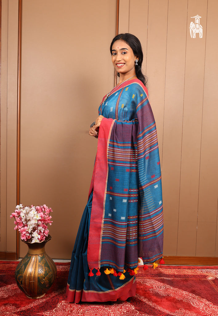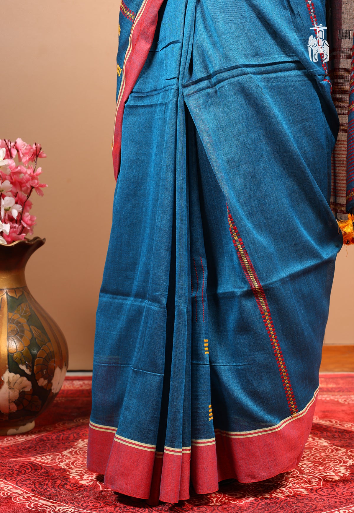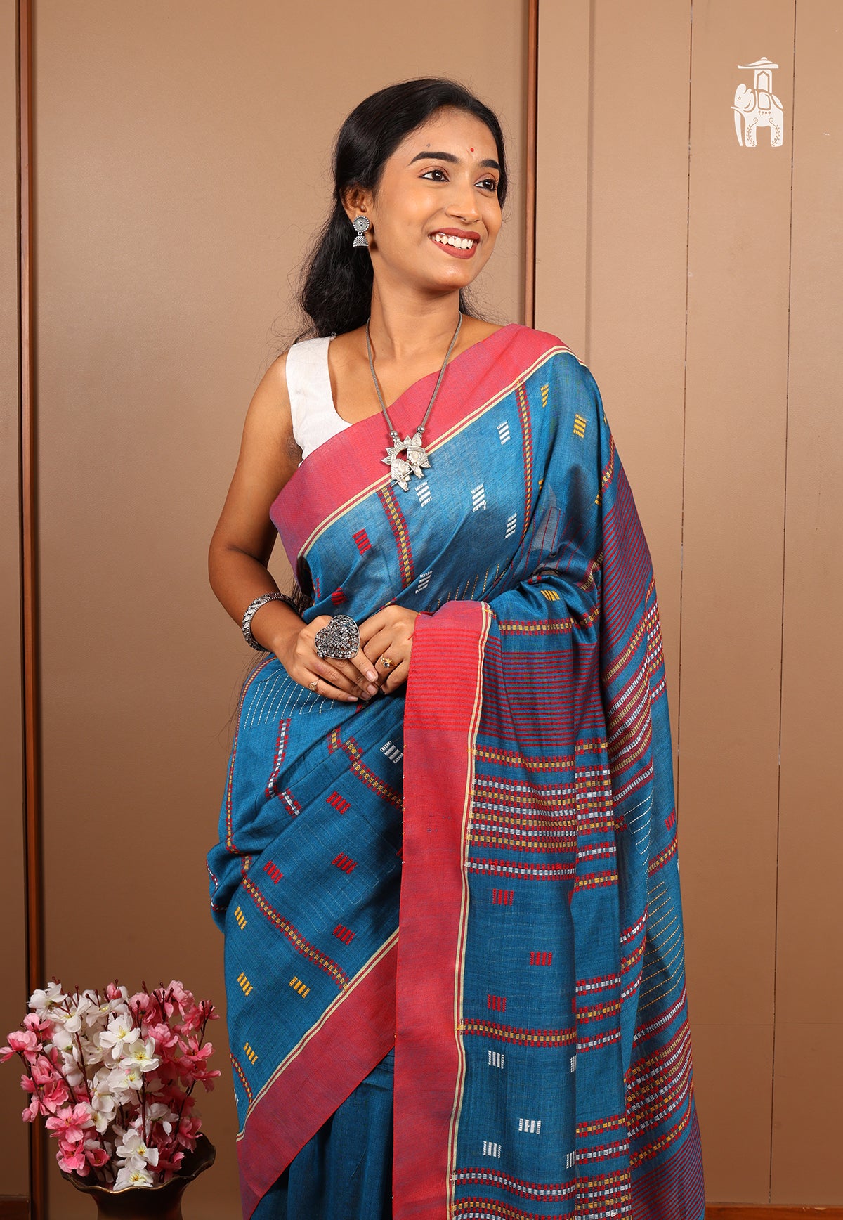 Whether visiting a friend or attending a pujo ritual, this Blue Khadi Cotton Saree is a must-have for all closets.