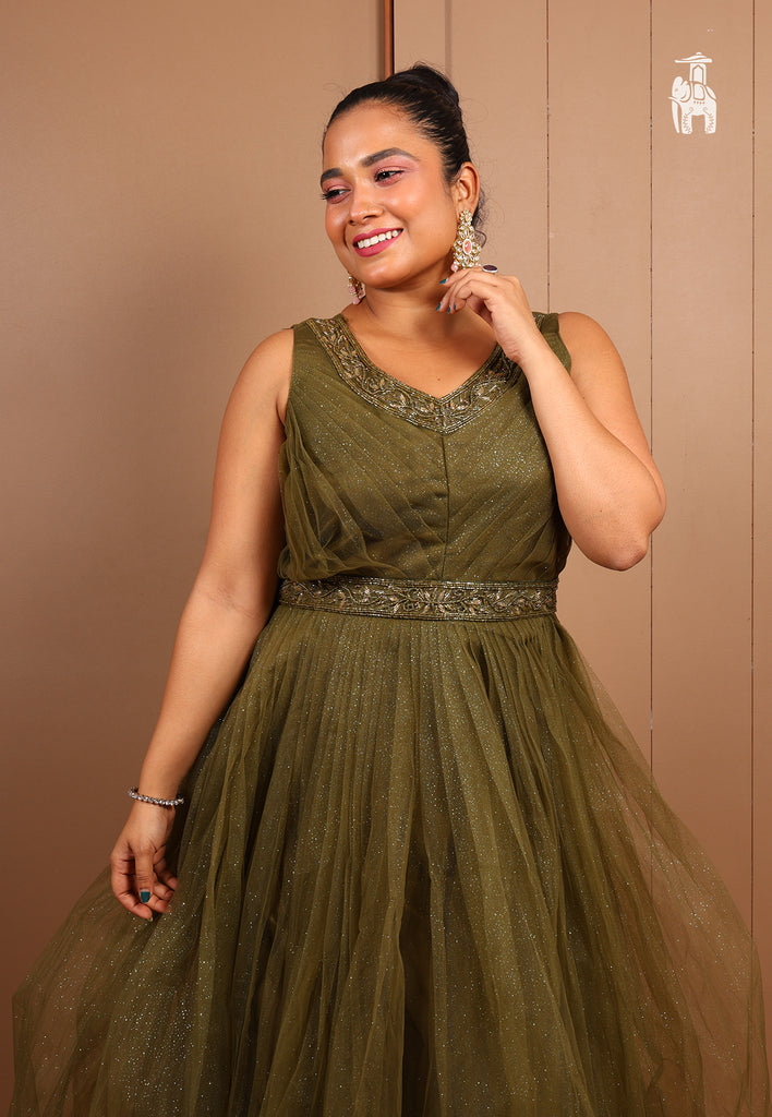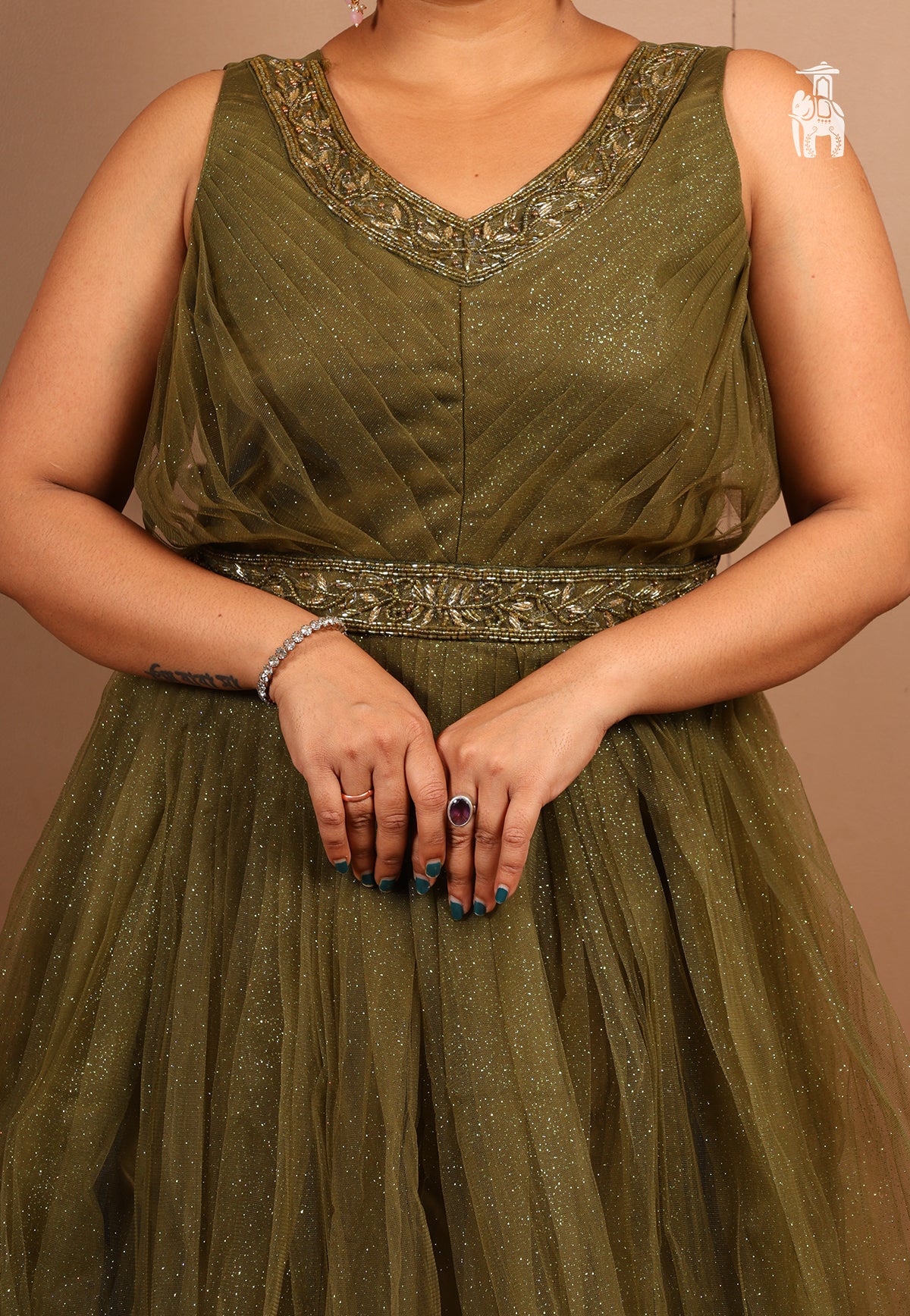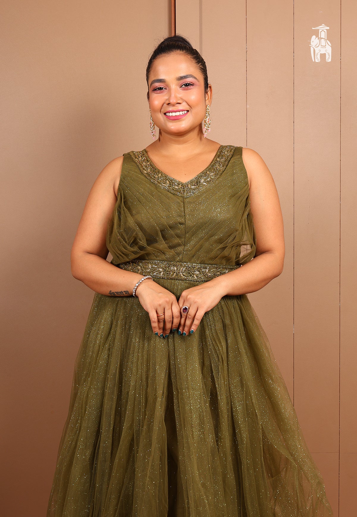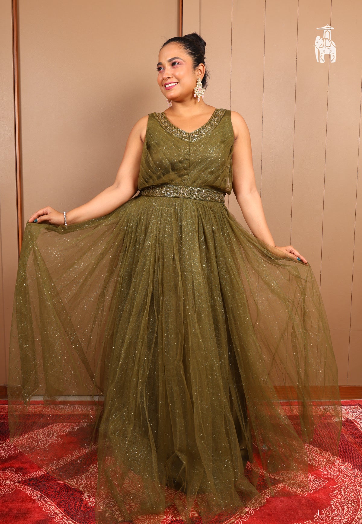 Carry yourself elegantly in this glamorous Olive Green Gown, woven of naturally shimmery fabric.