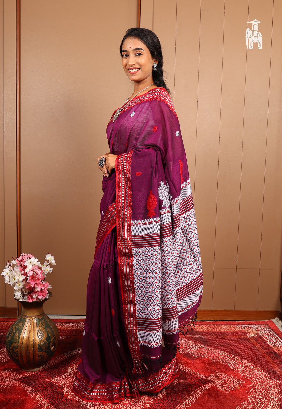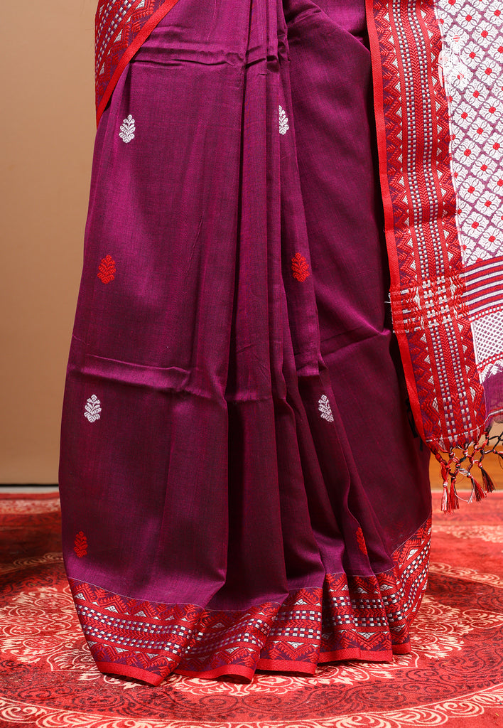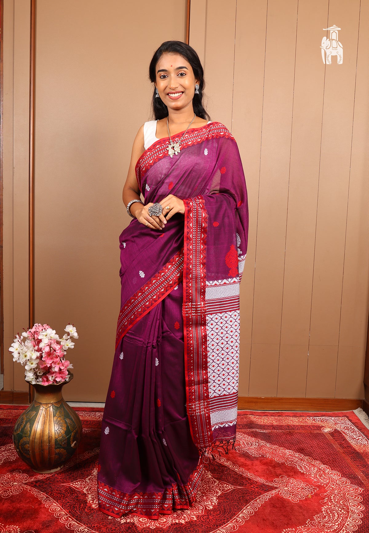 Shopping for Pujo? Buy this Purple Khadi Cotton Saree, featuring a beautiful border and small traditional butis that make you stand out on every occasion.