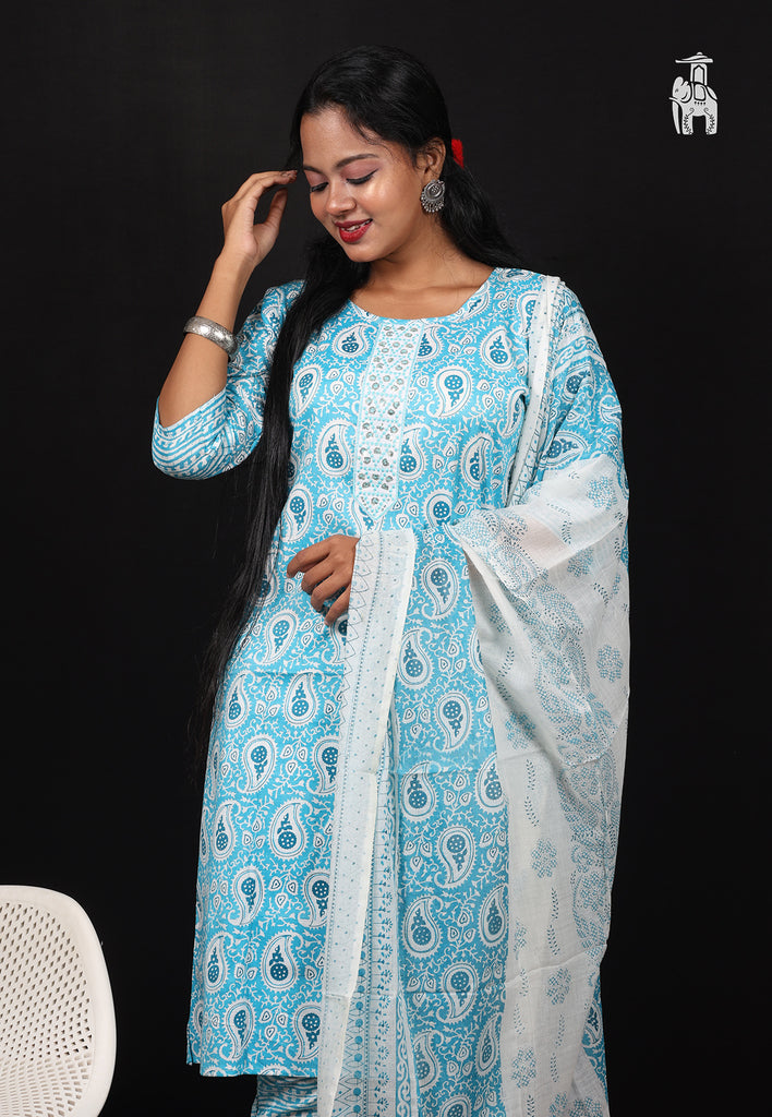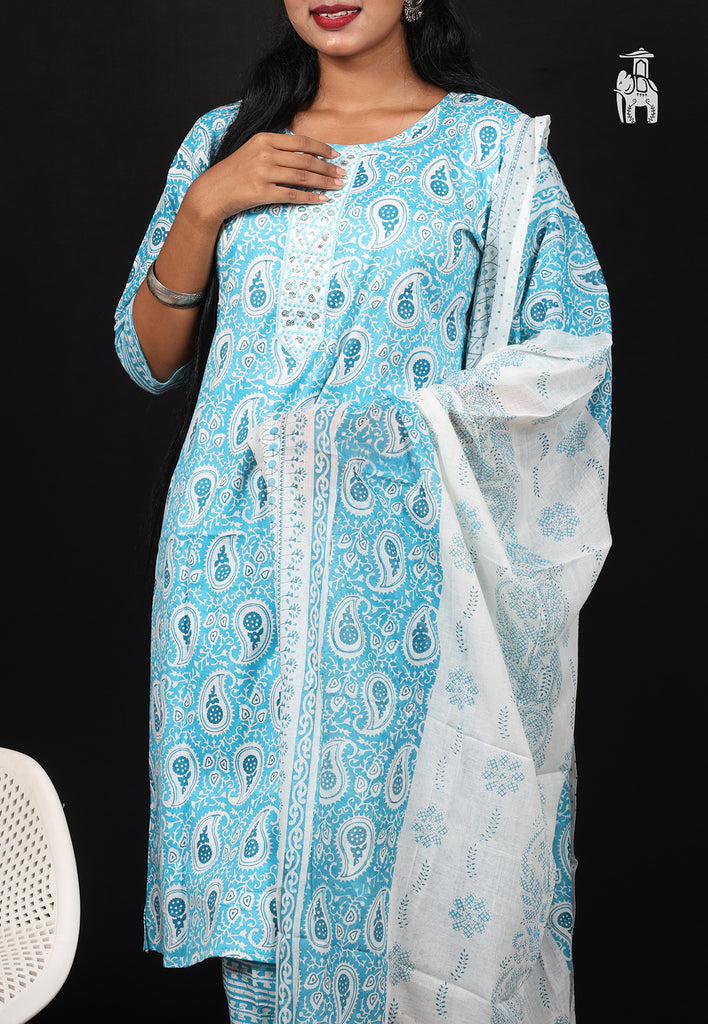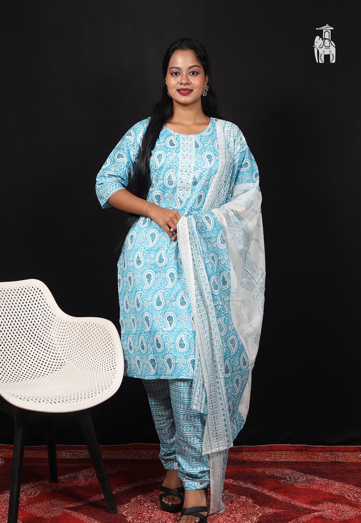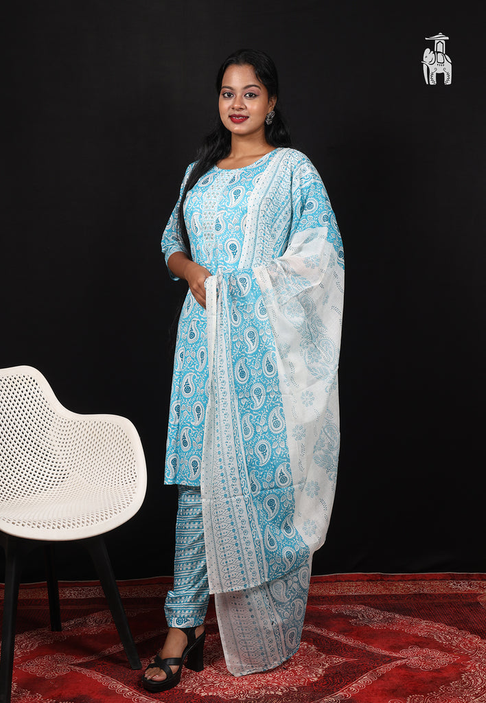 Make your formal appearance, stylish yet comfy, wearing this Blue Suit Set, that brings a 3-piece set of Blue straight fit kurta, pant & a dupatta.