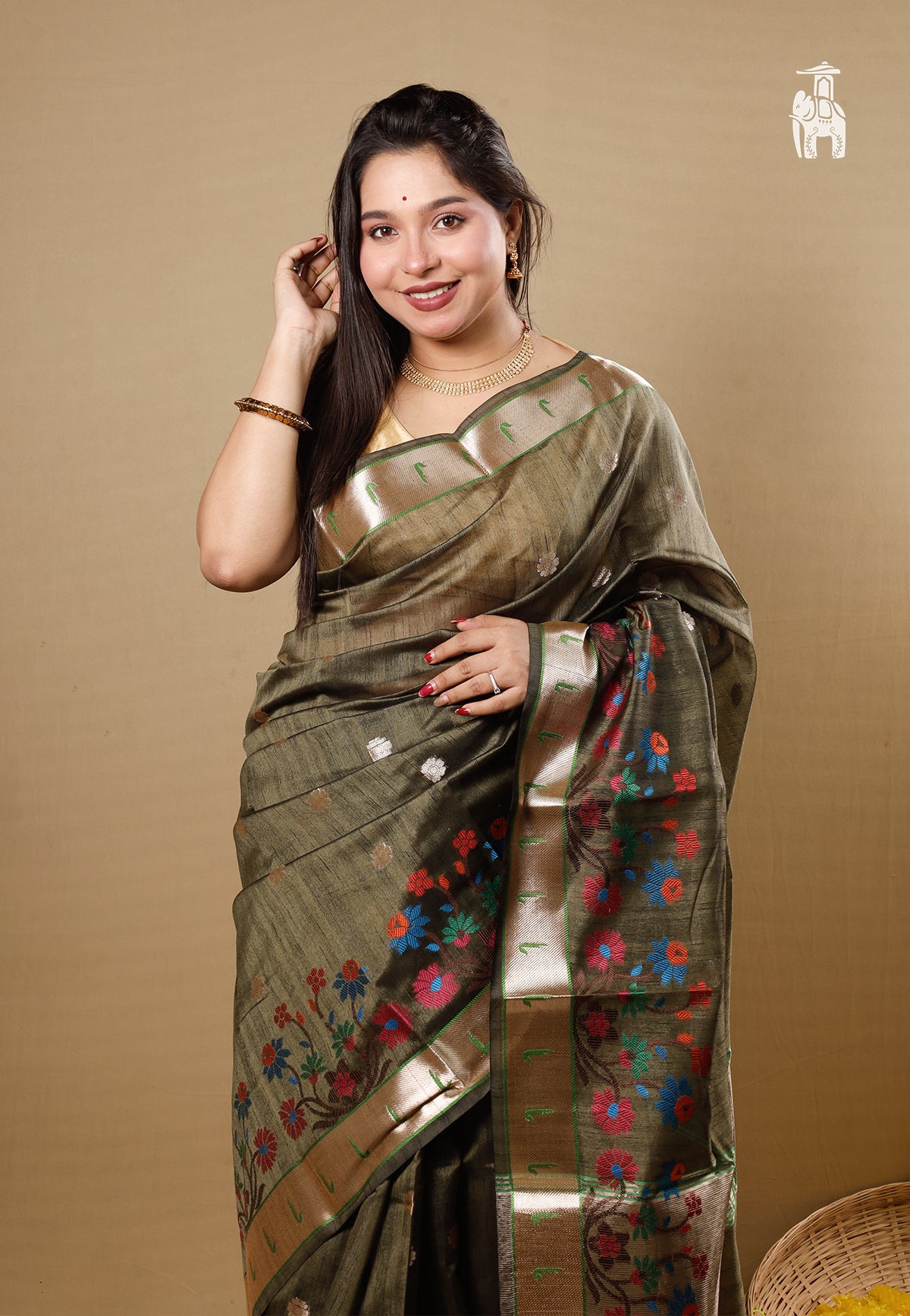 Curate a special party look in this Greyish Green Dupion Katan Saree with shimmery zari border, exclusively from our End of Season Sale.