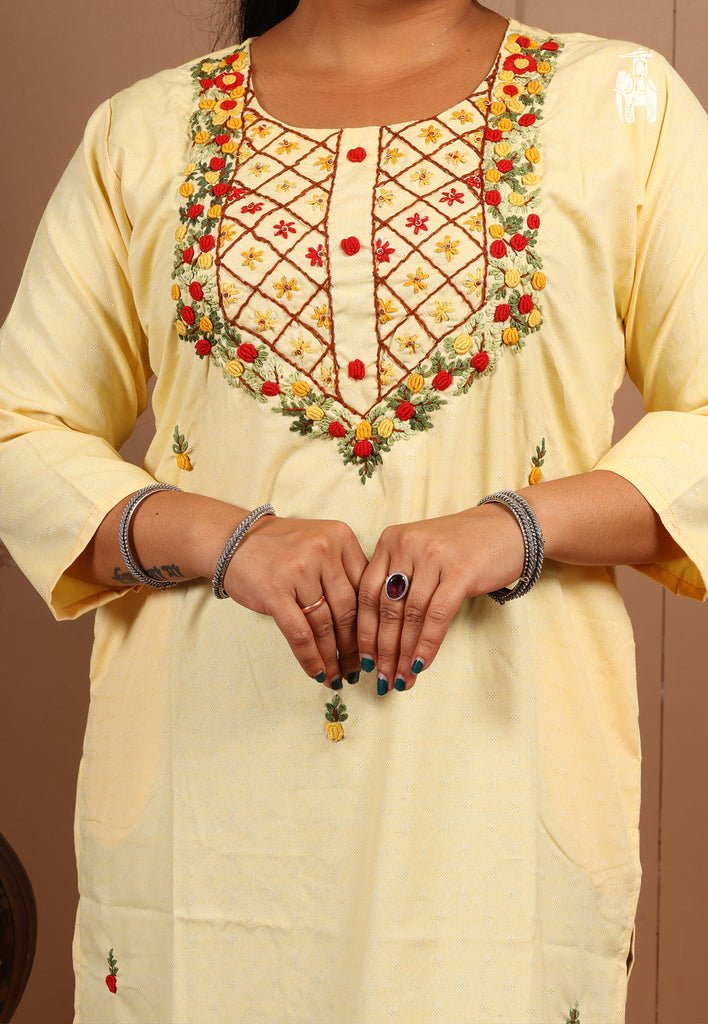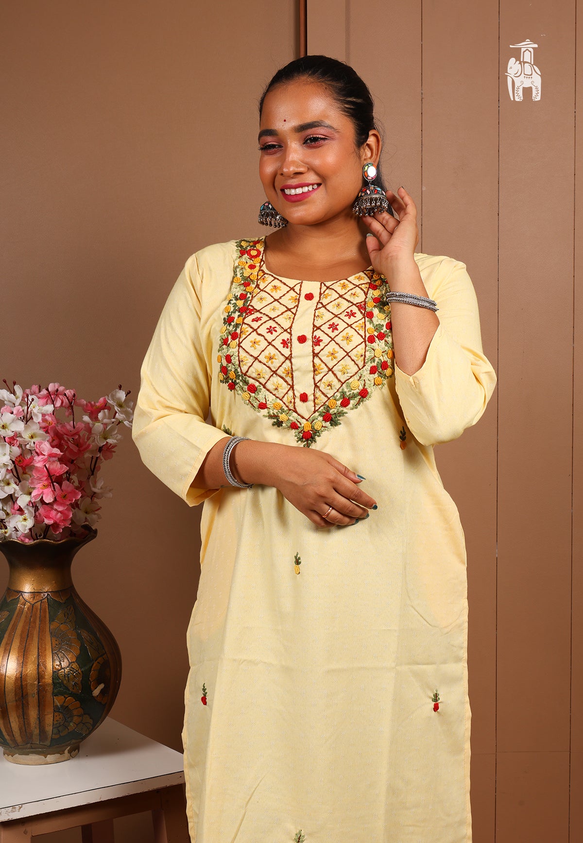 Woven of Rayon, this Kurti is soft, breathable & very comforting for any occasion. Kurti features floral embroidery work, & floral butis for an adorable festive look.