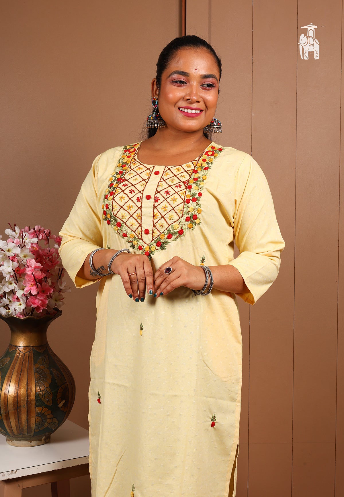 Make a fashion statement in this stylish Lemon Yellow Kurti Pant Set, which comes with a Light Yellow Kurti & Olive Green leggings.