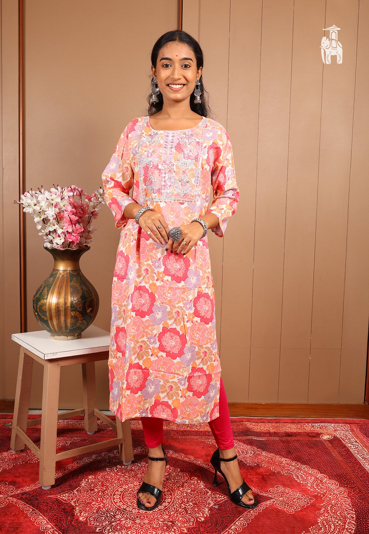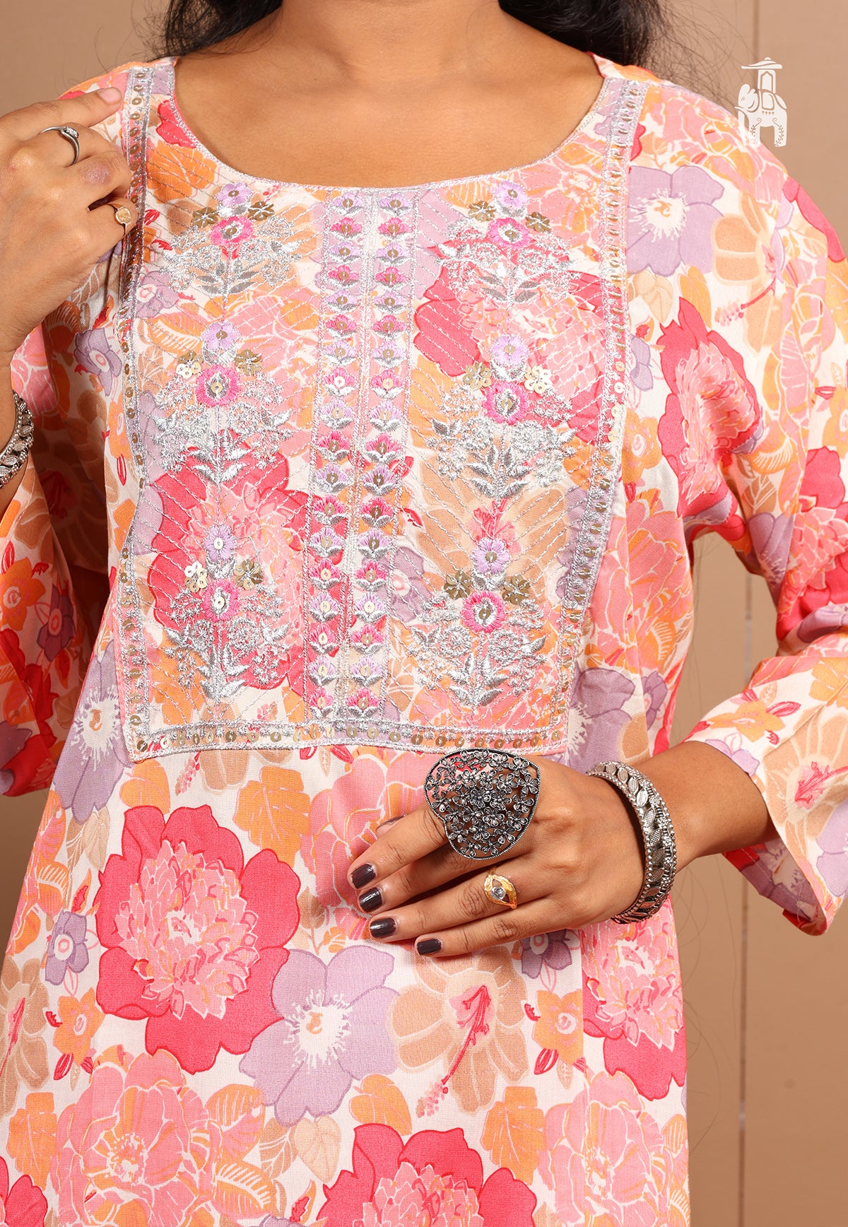 Our Pink Kurti Pant Set comes in a subtle tone of Pink, flattering floral prints & threadwork embroidered designs.