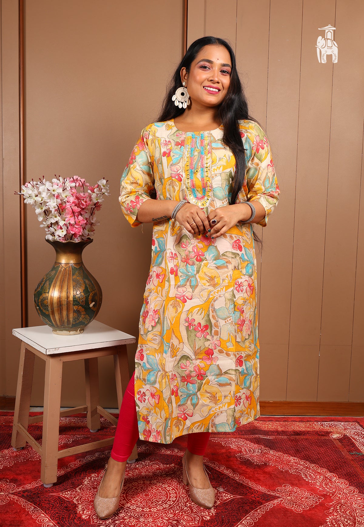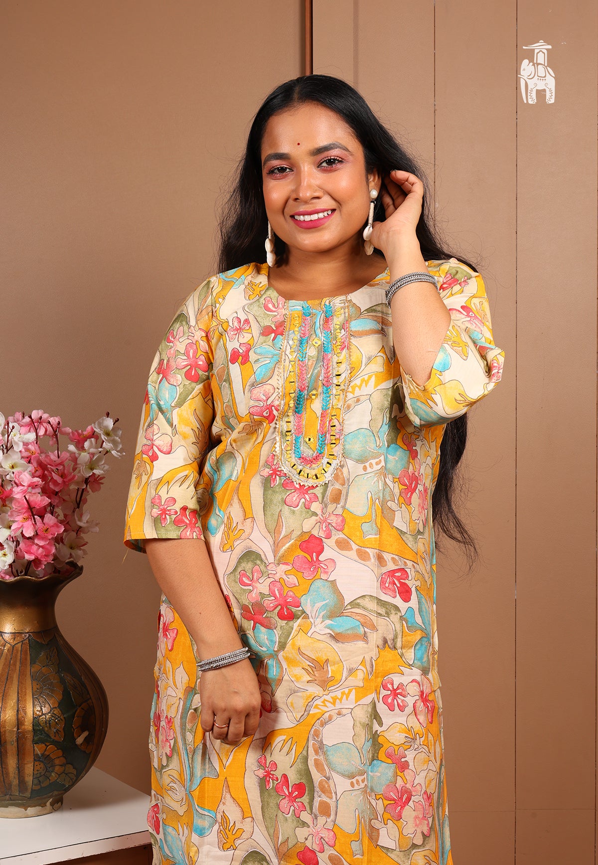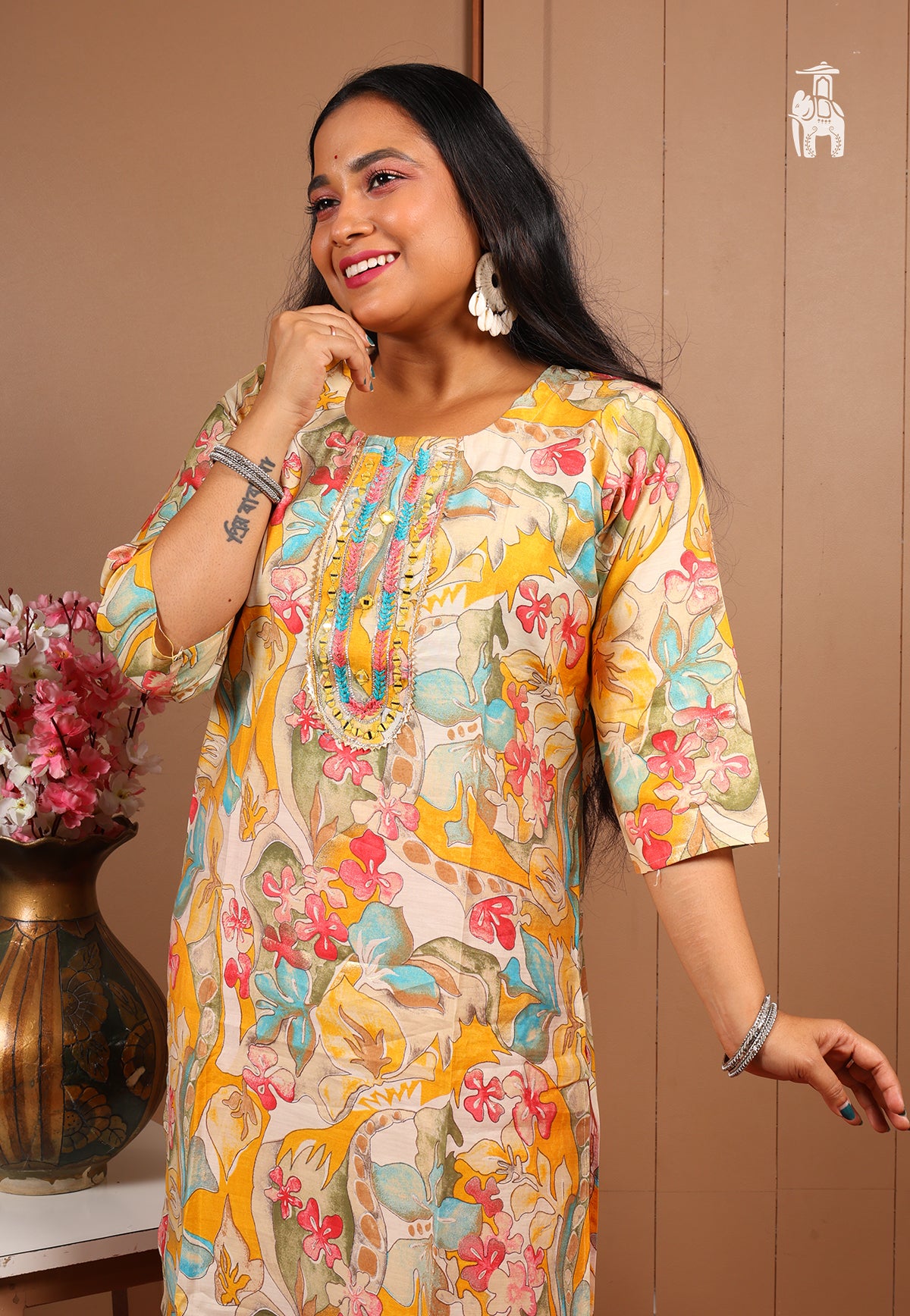Kurti features a round neckline, & lovely floral details for you to get effortlessly ready for any formal or casual occasion.