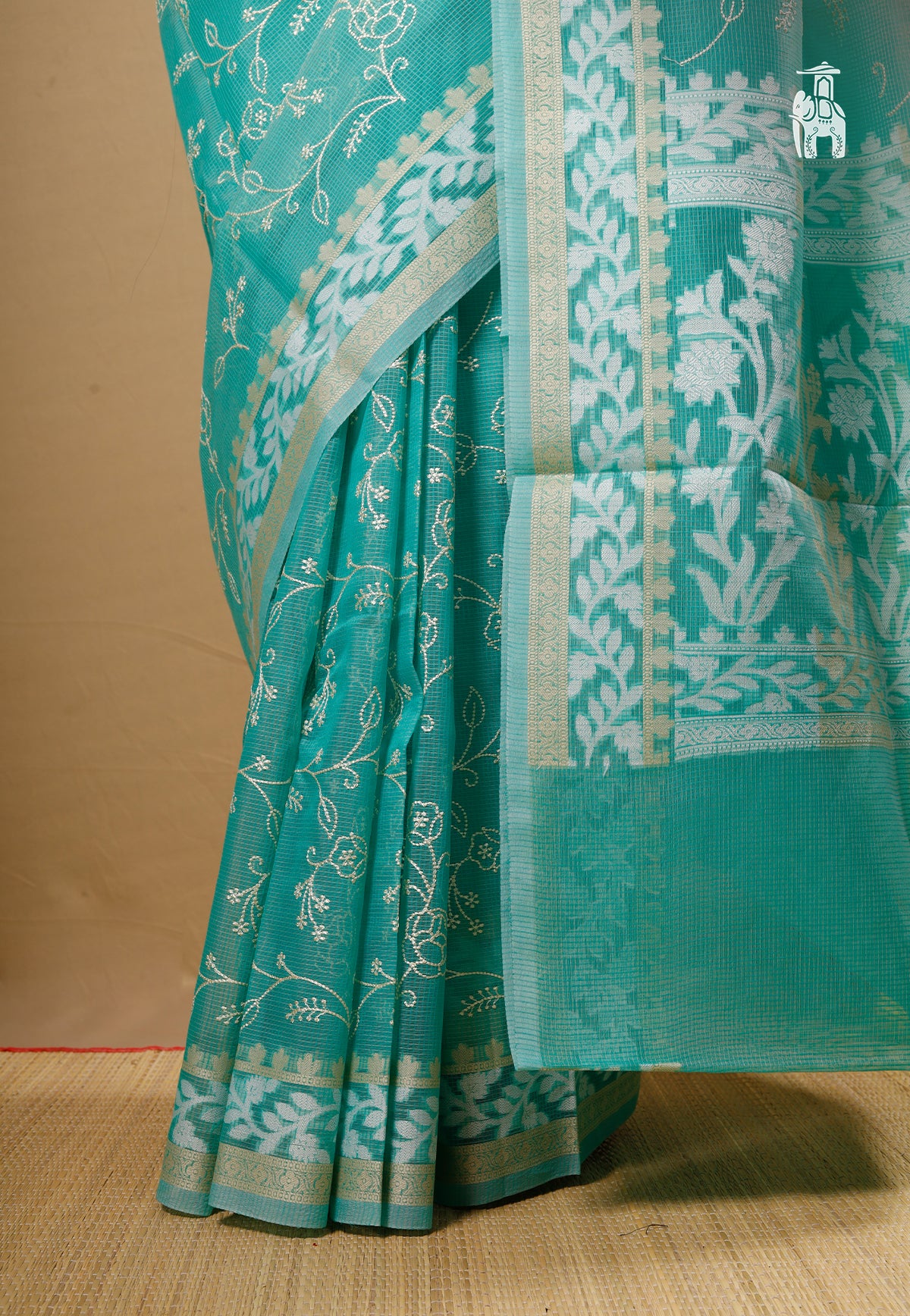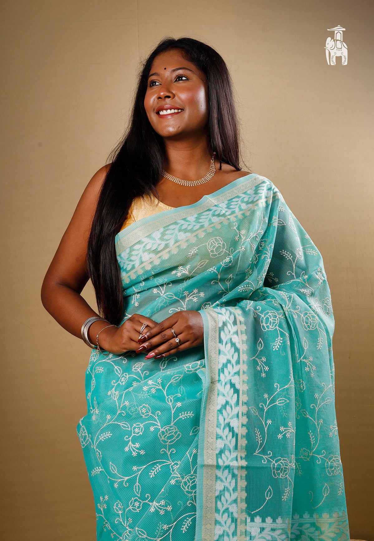 Bring out your best with this brand new Aqua Blue Embroidered Kota Saree, flaunting floral embroidery work on a subtle shade of Blue.