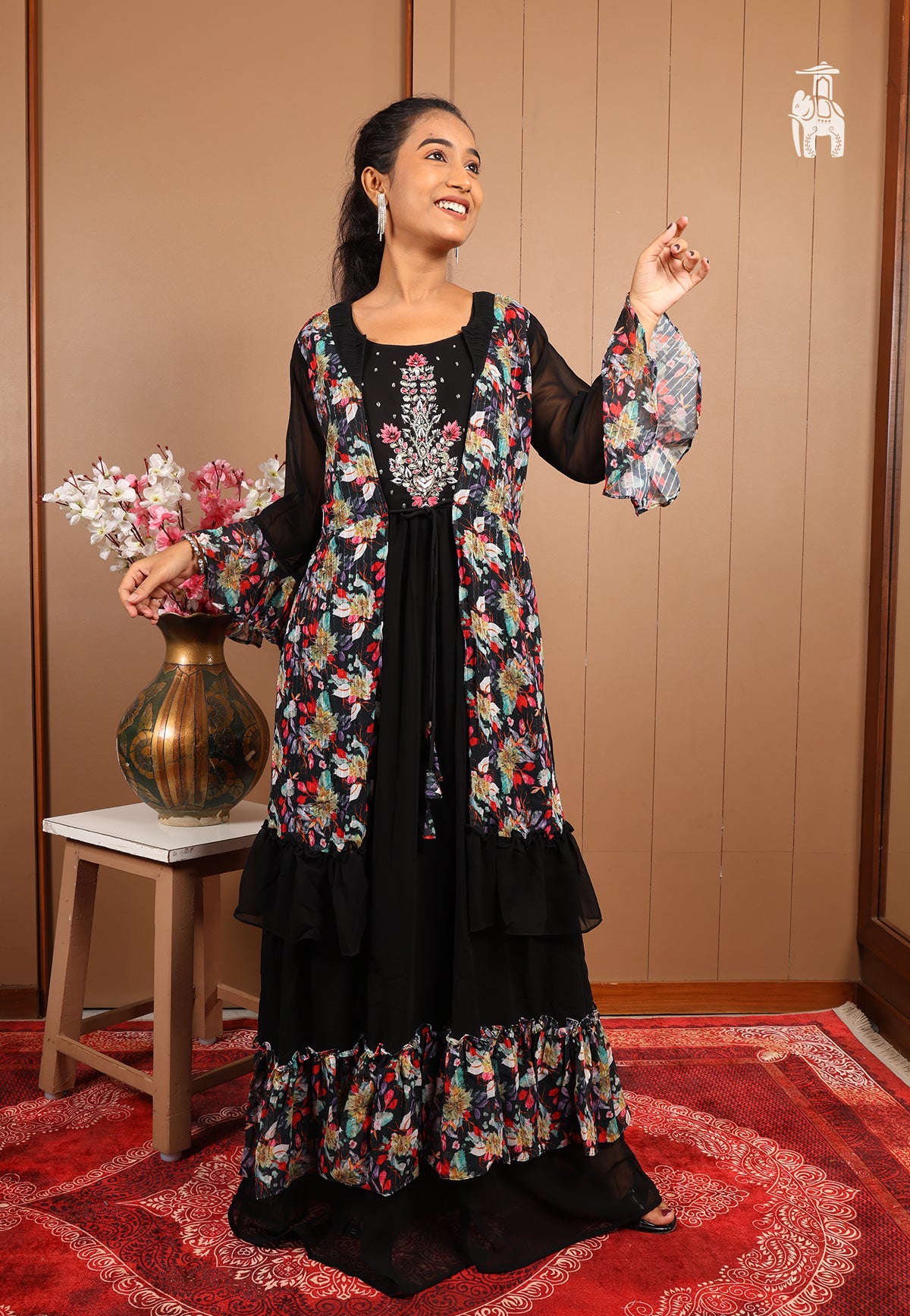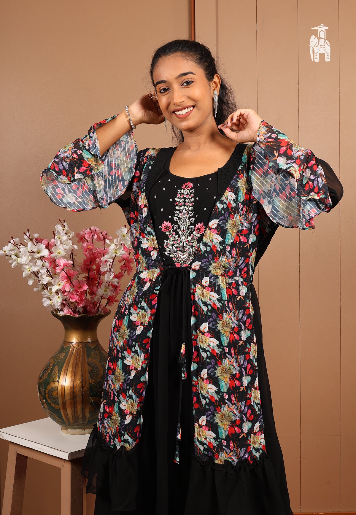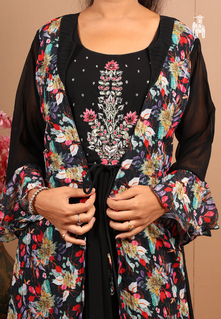 This long one-piece has got you floral & stone-work designs, with a shrug-like look curated for your festivities & joyous moments.