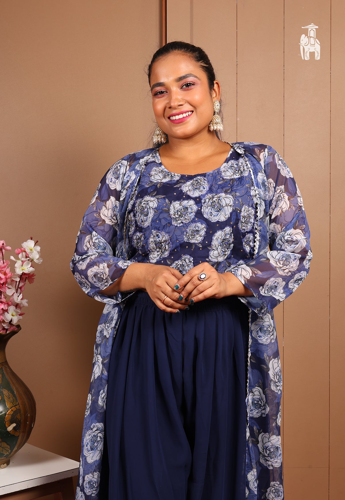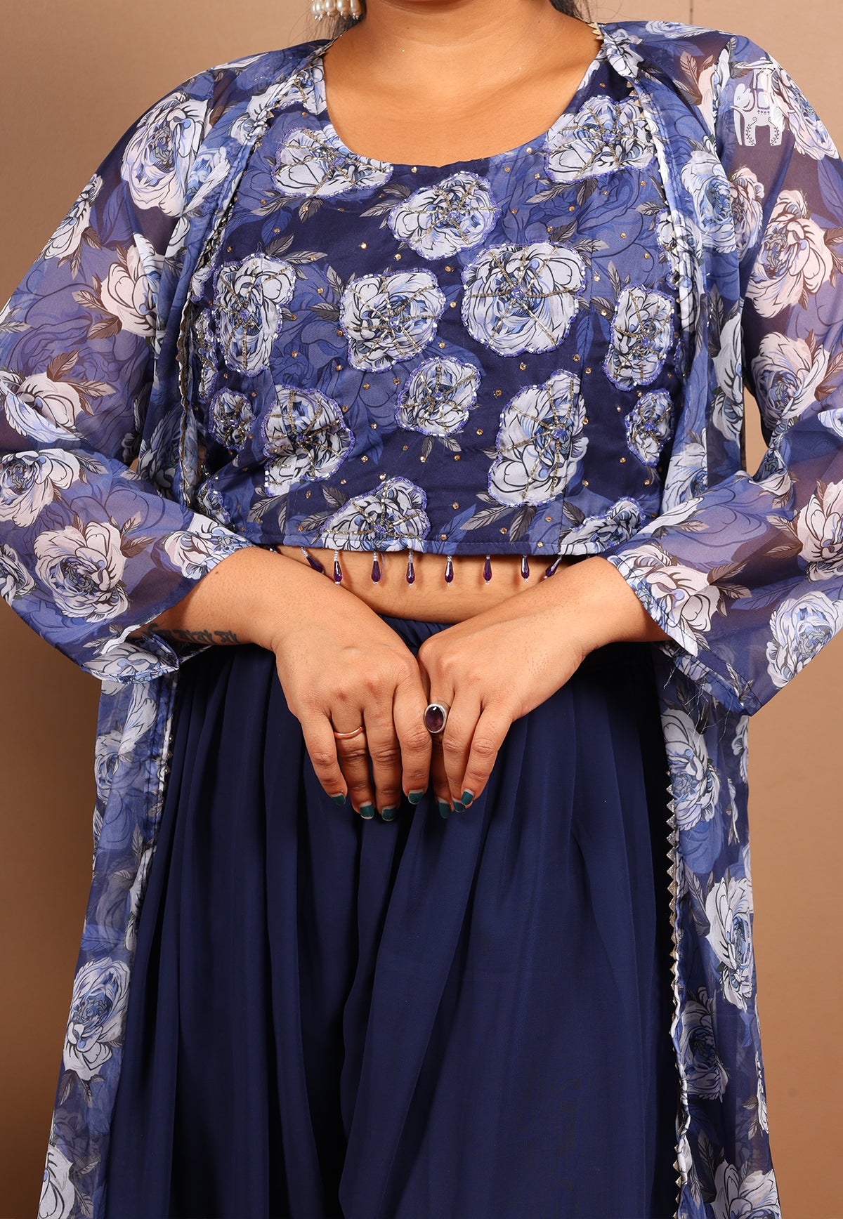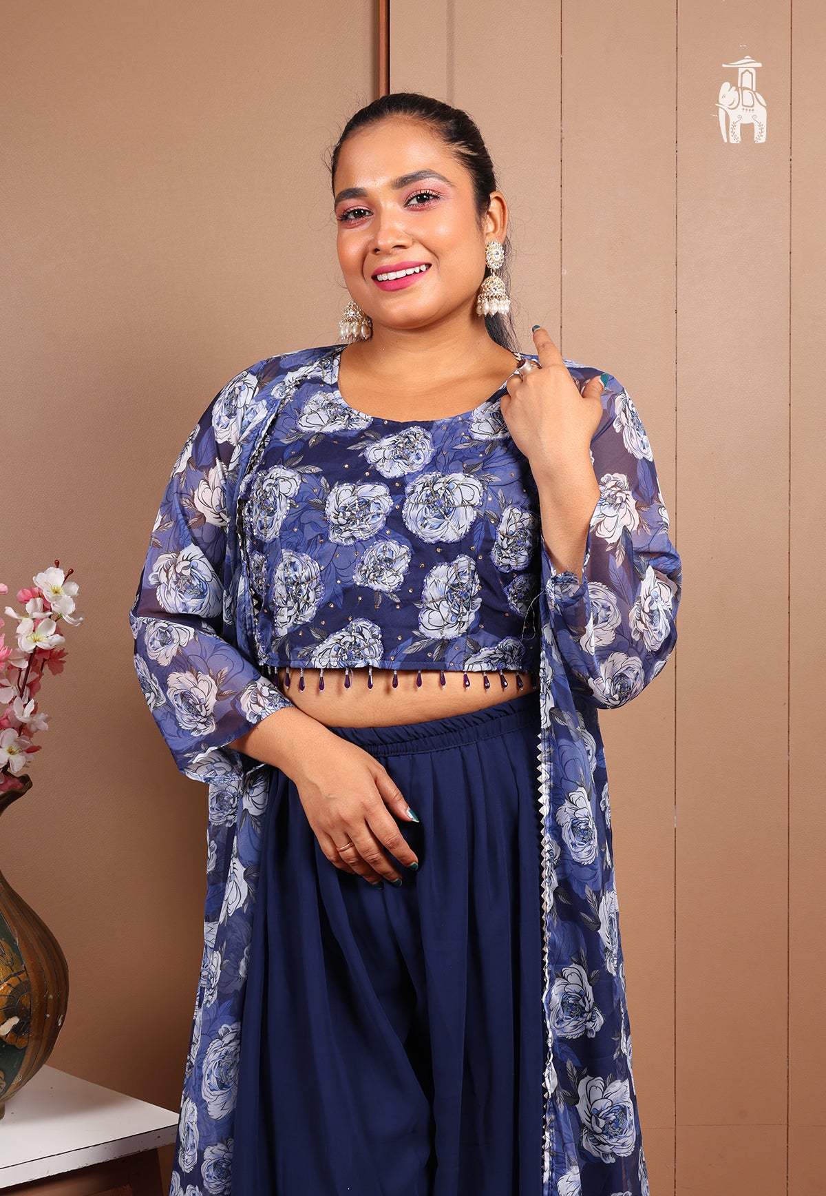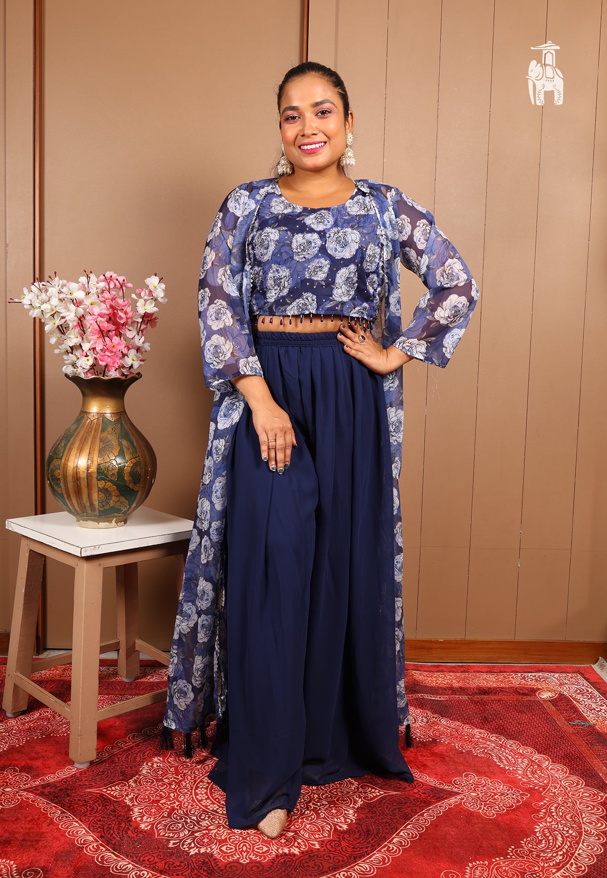 In this set, you get a floral printed crop top, plain trouser & a matching Blue floral printed shrug to style up with the Co-Ord set.