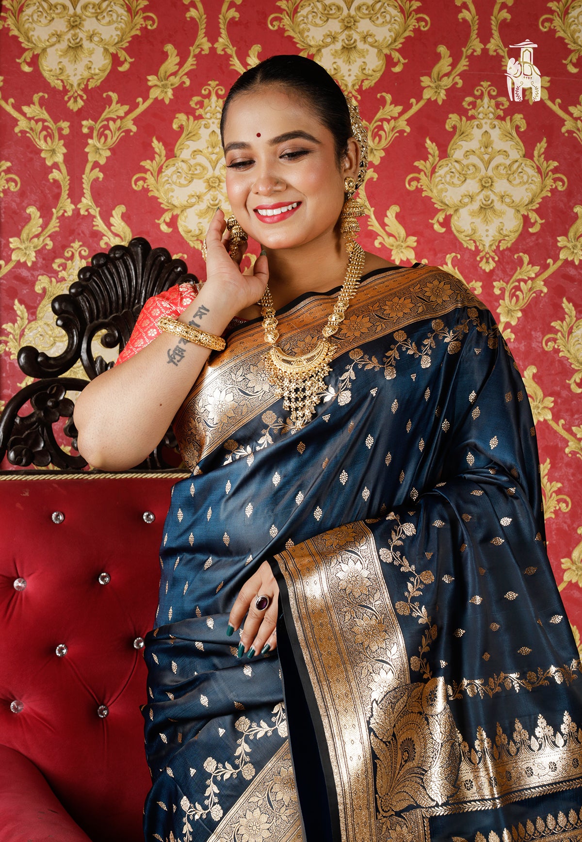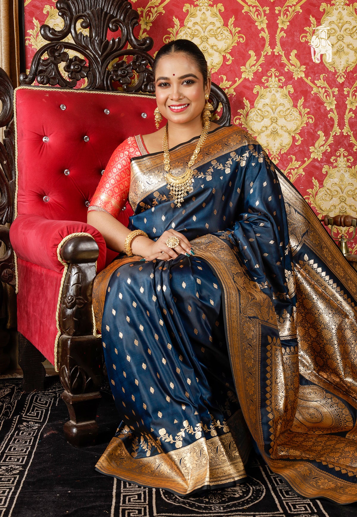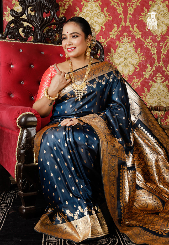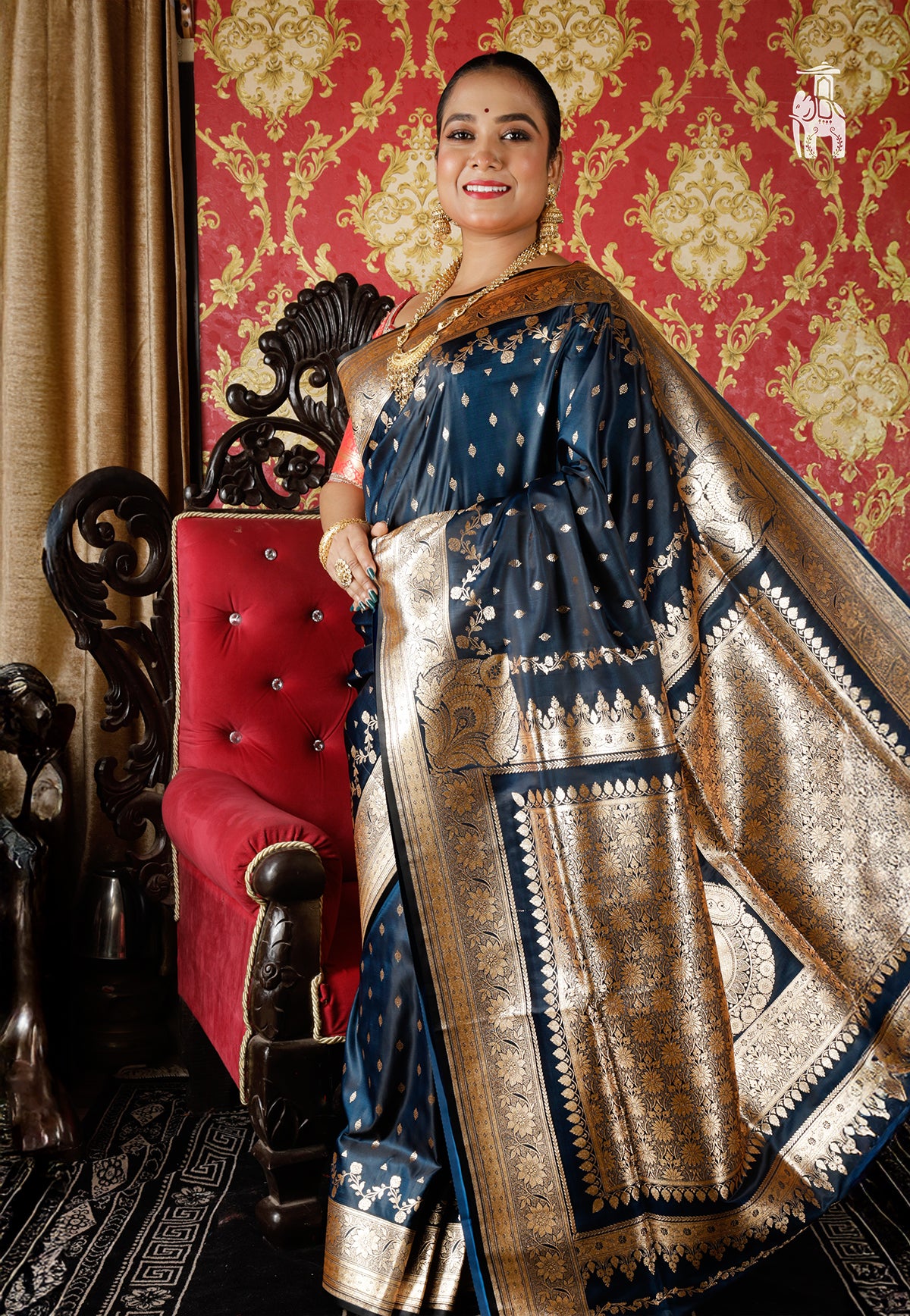 Celebrate your wedding function in this luxurious Blue Satin Katan Banarasi Saree, exclusively from the wedding collection of Legacy of Bhojraj.