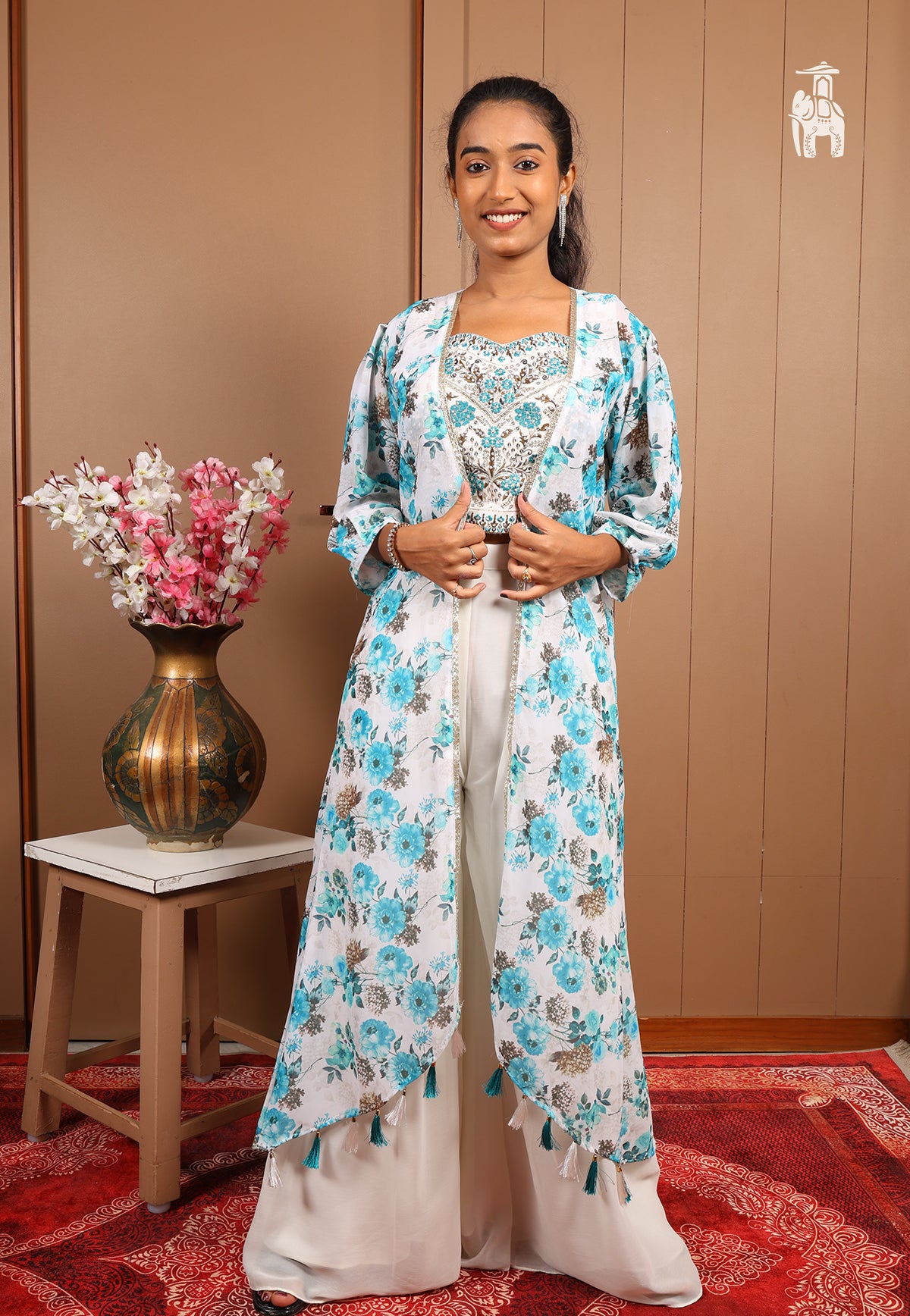 This outfit offers a floral printed smart top, plain pant, & a shrug with tassel work designs.