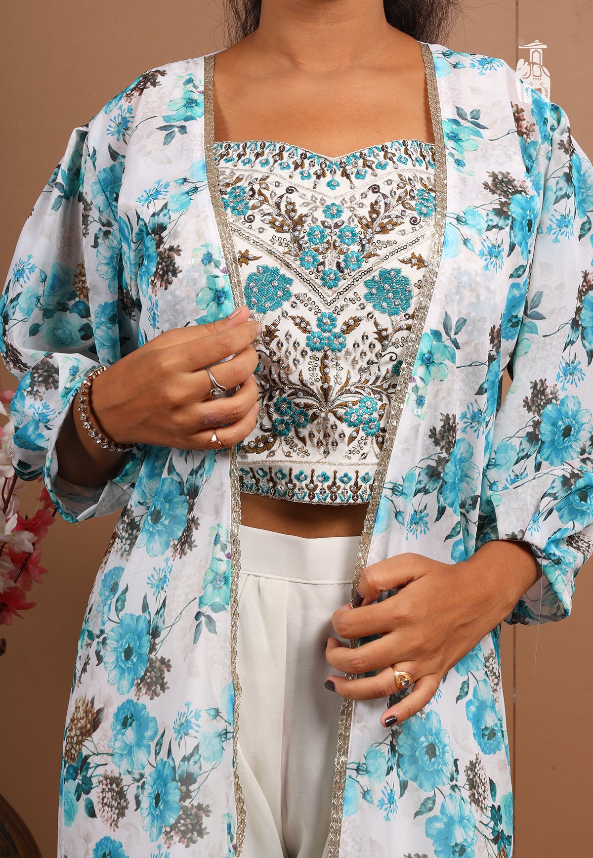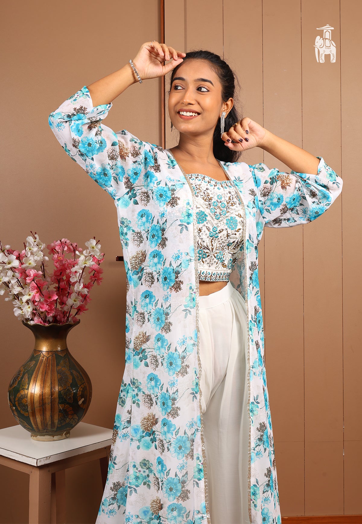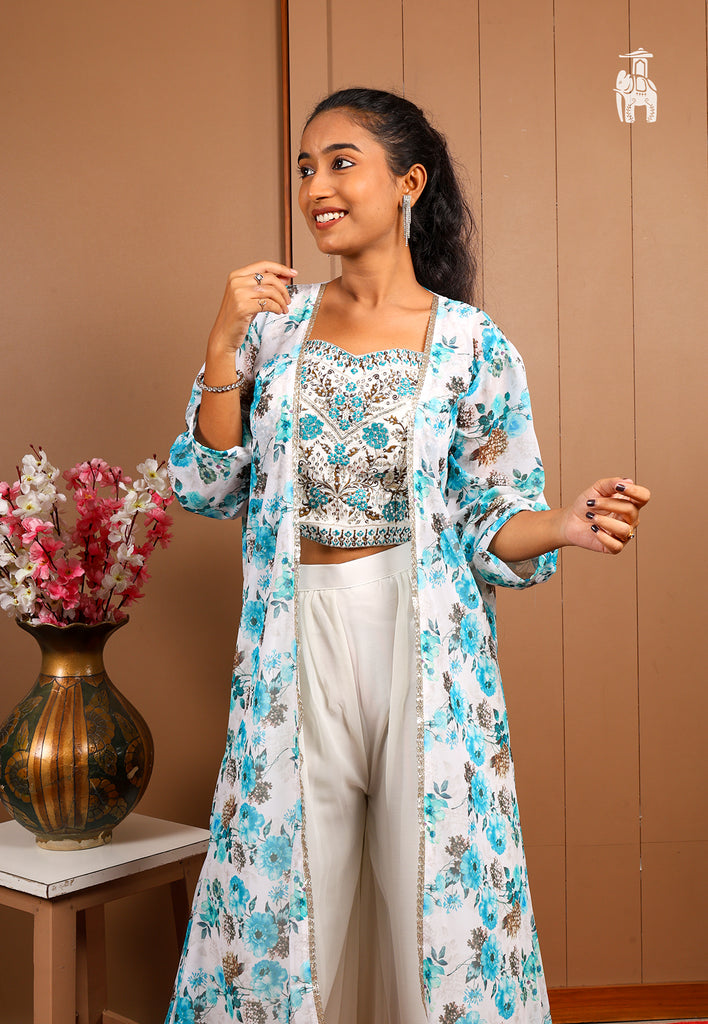 Embrace your festive confidence, in this latest White Co-Ord Set featuring a set of top & pant, with a floral printed shrug for a smart look instantly.