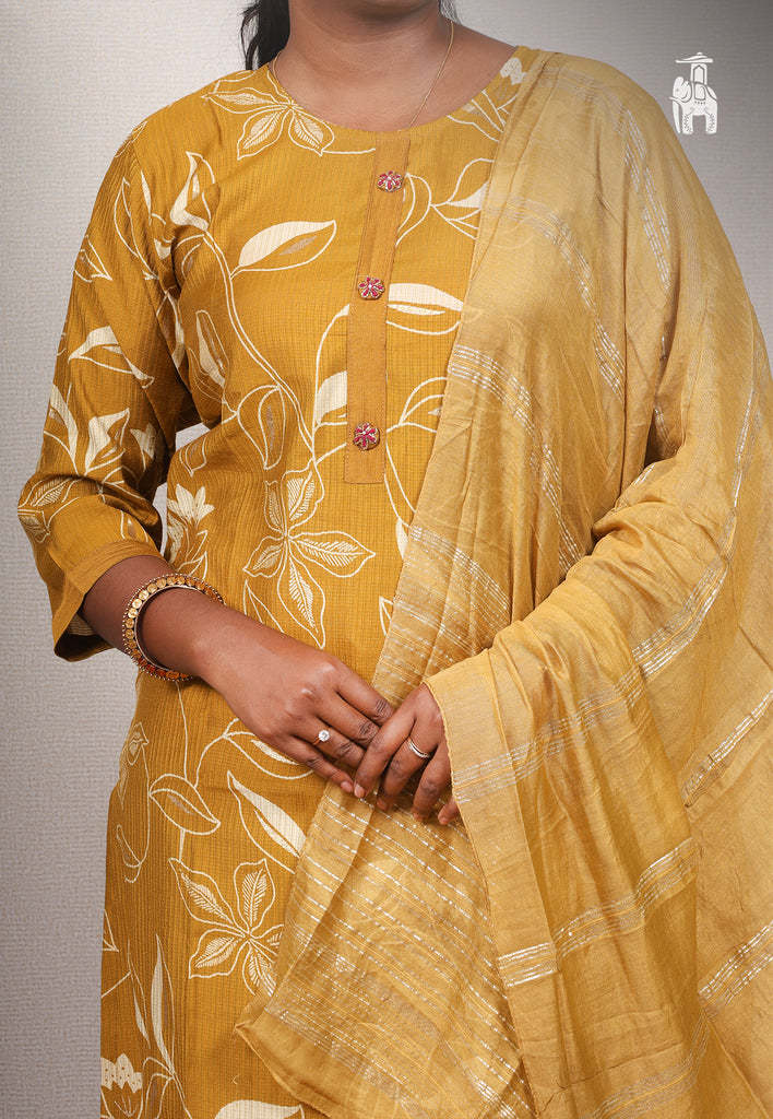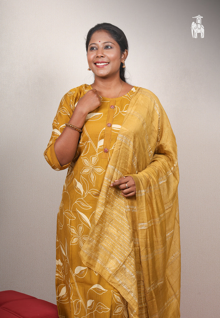Shop this Yellow Suit Set with printed floral designs, a matching pant & a plain dupatta with silver threadwork designs.