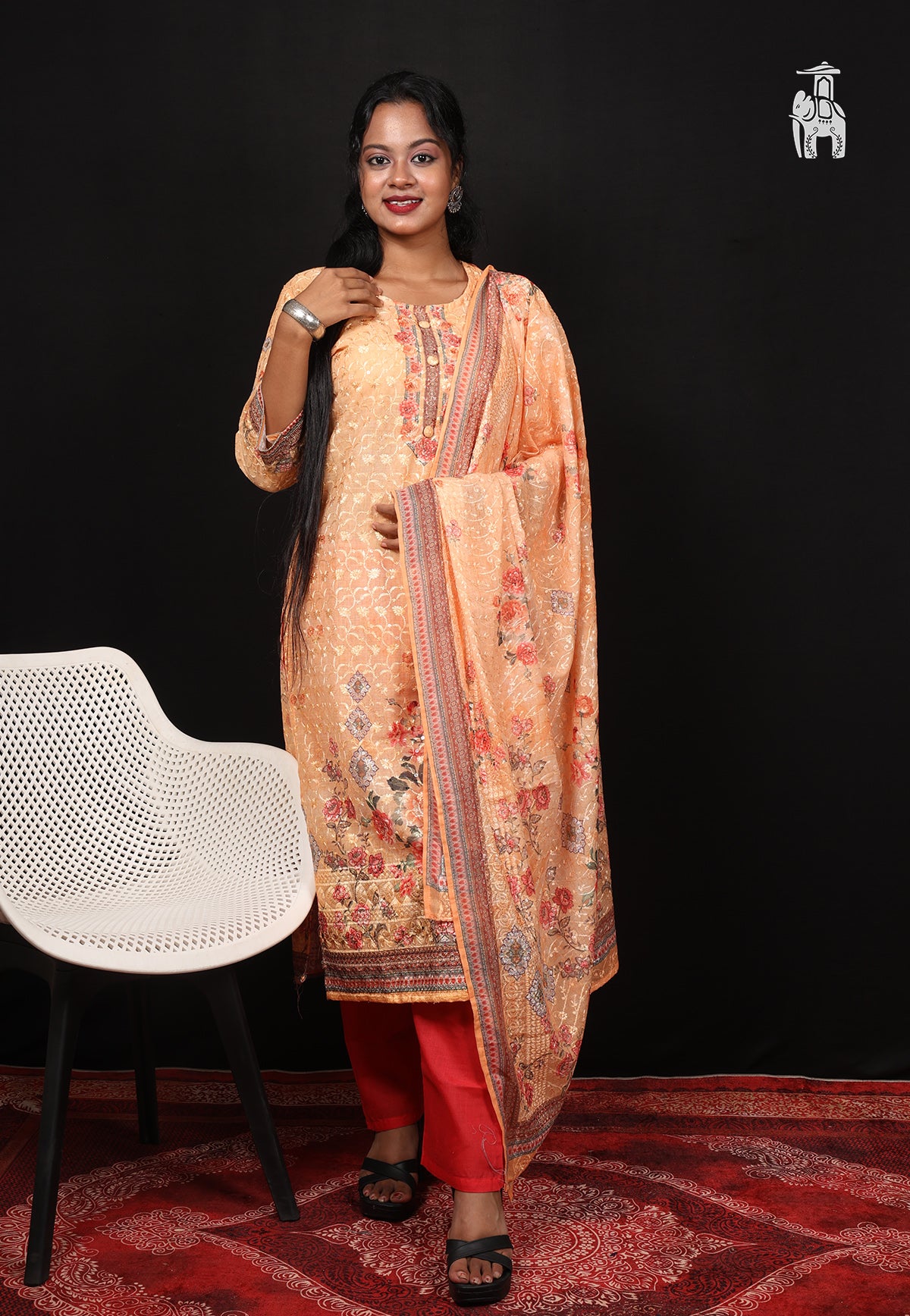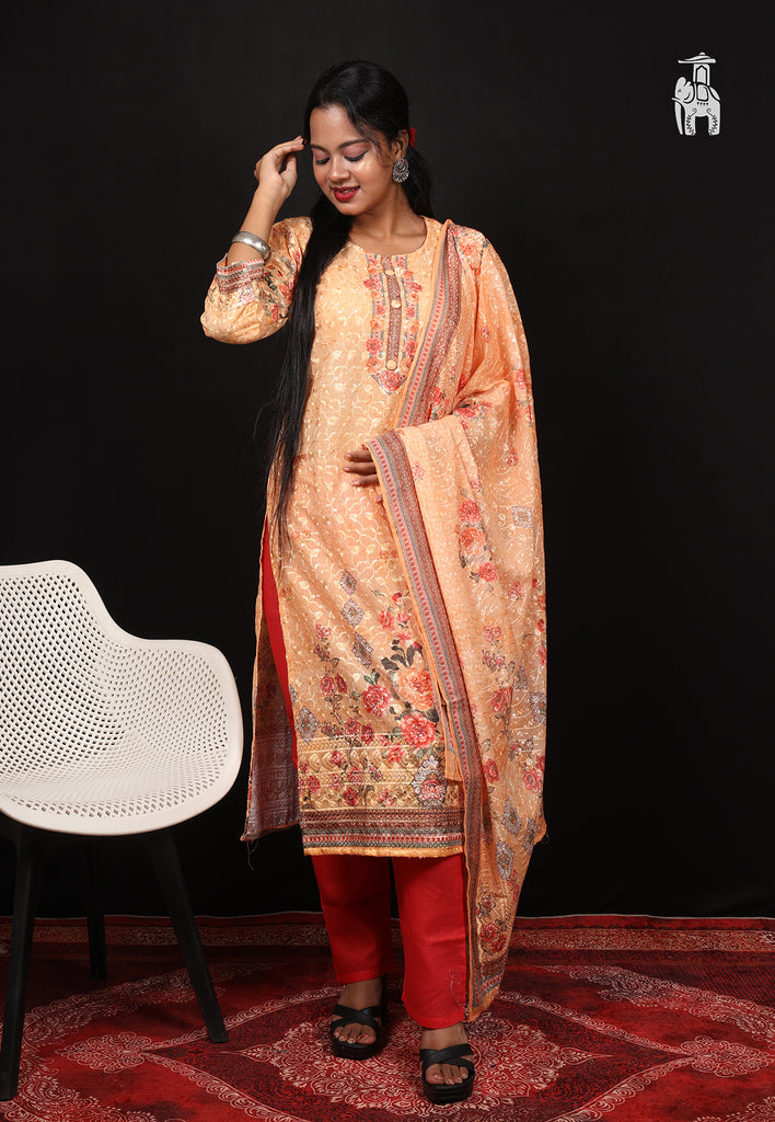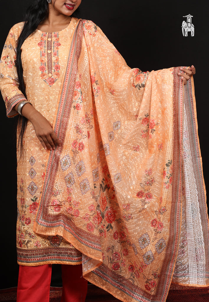 Suit of the set, features subtle floral designs around it’s round neckline, & all over embroidered work. You get a simple Red pants, fully designed dupatta.